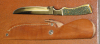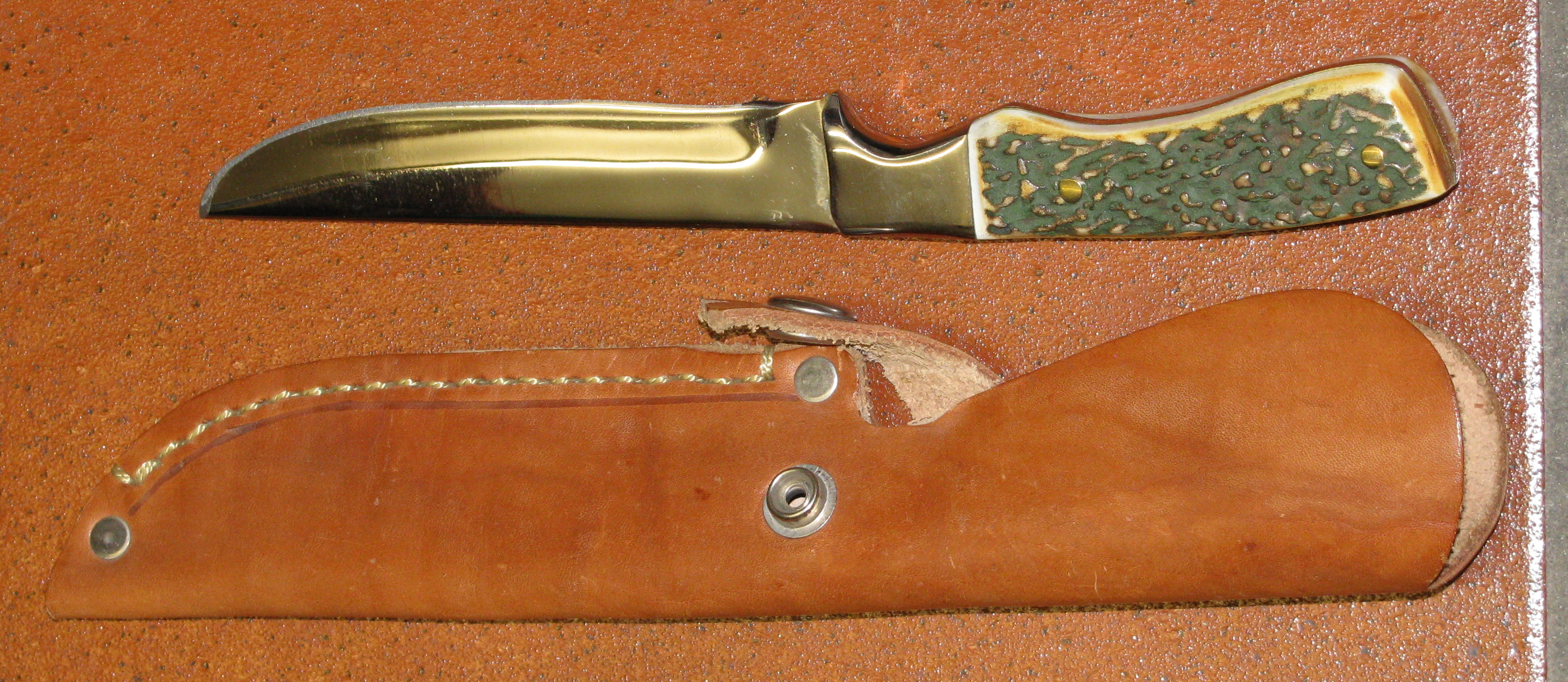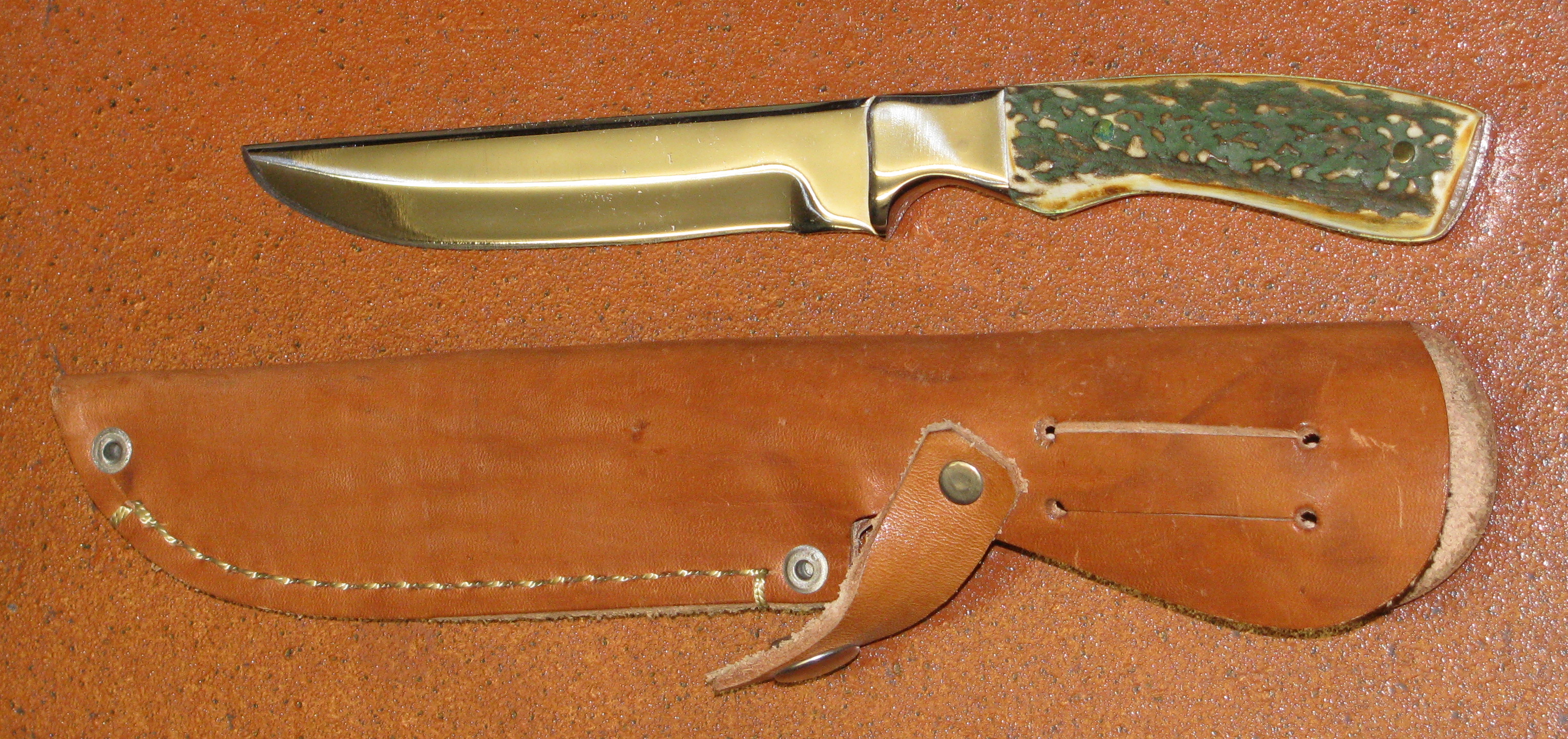 Zum Verkauf kommt ein Jagdmesser mit Horngriff und Lederscheide