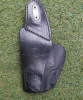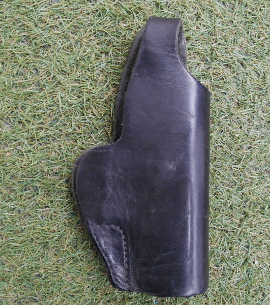 kleineres schwarzes Leder Holster für Pistolen oder Revolver mit altersbedingten Gebrauchsspuren.
