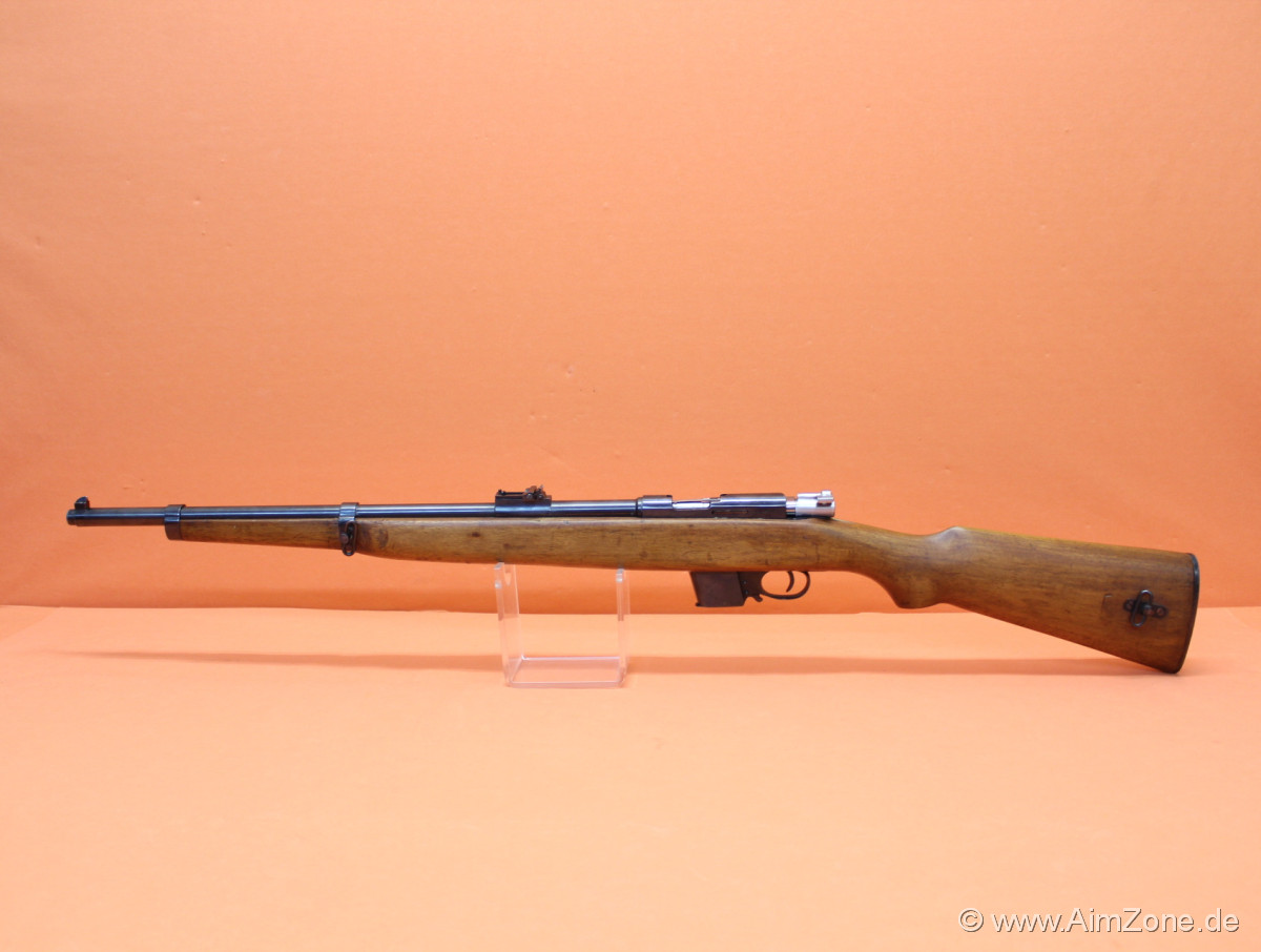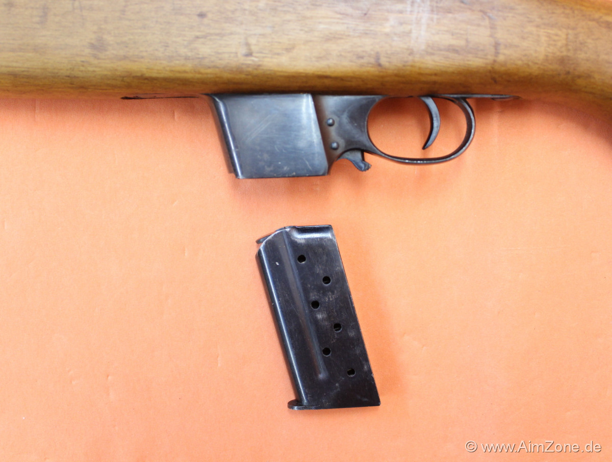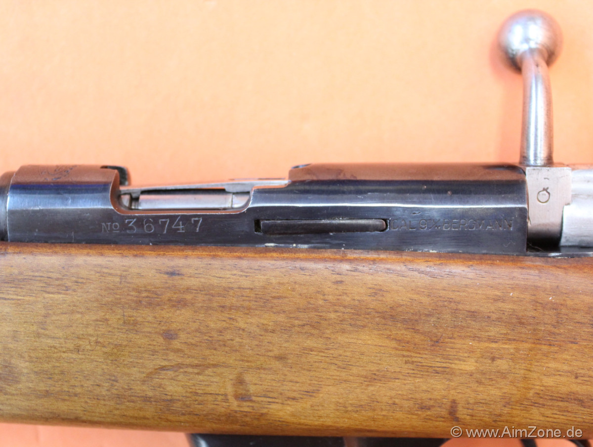 55cm Lauf mit Dachkorn/ klappbares Leiternvisier bis 700m, Systemhülse gestempelt: [DESTROYER [Schiffsshilouette] TRADE MARK], seitlich "CAL 9M/M BERGMANN", Holzschaft mit Riemenbügel (seitlich)/ Kolbenplatte, Unterring mit Riemenbügel (seitlich)/ 6-Schuß Einsteckmagazin. Gebraucht-/ Sammlerwaffe (ohne Zusicherung von mangelfreier Funktion/ Präzision). *Differenzbesteuerter Artikel nach §25a UStG*