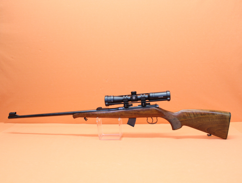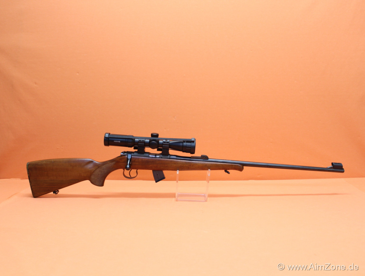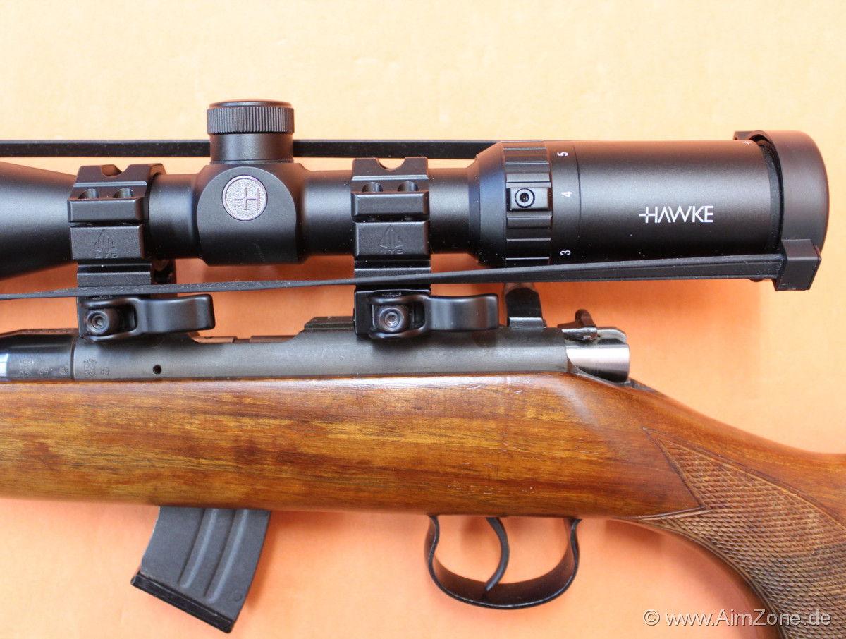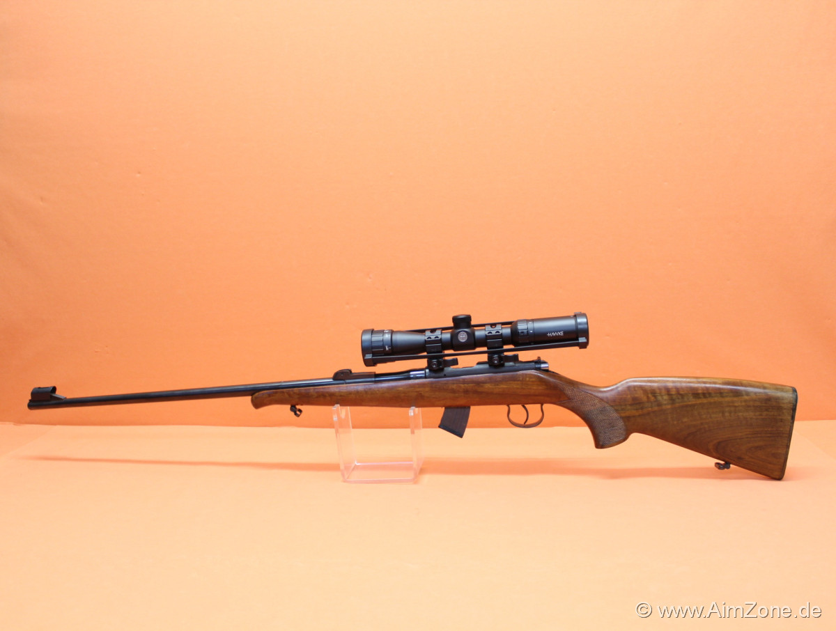 63cm Lauf, Kornhalter mit Balkenkorn/ Kornschutz, Schiebevisier fehlt(!), Systemhülse mit 11mm Prismenschiene, Holzschaft m. Fischhaut/ Riemenbügeln, 10-Schuss Stahl-Einsteckmagazin. Incl. Zielfernrohr Hawke Vantage 2-7x32 AO (MilDot-Absehen)/ QD Aufkipp-Montageringe. Gebraucht-/ Sammlerwaffe (ohne Zusicherung von mangelfreier Funktion/ Präzision). *Differenzbesteuerter Artikel nach §25a UStG*