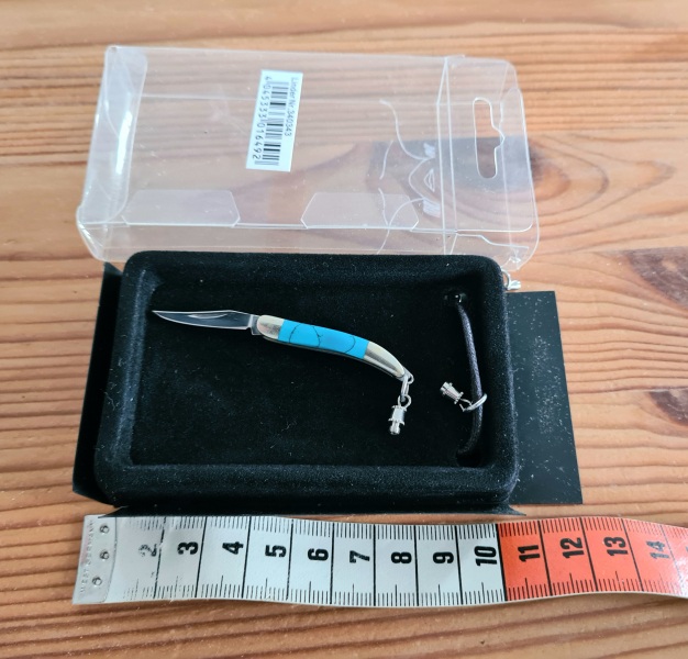NEUWARE: Siehe die Fotos - Sie kaufen genau das Messer, welches Sie hier sehen. Unbenutzt - einige Jahre alt - lag immer nur im Tresor - wurde nie komplett ausgepackt. Das Messer kann man von der Kette abschrauben und dann nutzen. Auf dem Messer selbst steht nichts. Das Schmuck-Messer ist noch in der original Verpackung und im original Karton.