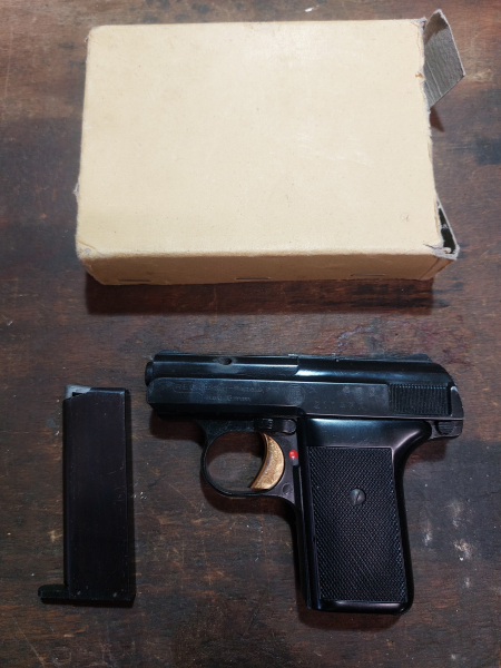 Es handelt sich hierbei um eine sehr schöne, gut erhaltene Reck P10 Start-Pistole mit dem goldenen Abzug. Kal.8mm Beste "Made in Germany" Qualität welche heute nicht mehr zu bekommen ist. Klein handlich aber auch sehr laut und robust. Kenner wissen bescheid, sehr zuverlässig und stabil. Eine der besten P8 nachbauten noch ohne Sollbruchstelle am Patronenlager. Diese Waffe wurde bis auf minimale Abweichungen als scharfe Waffe im Kaliber 6,35 gebaut. Die angebotene Pistole im Kaliber 8mm hat ebenfalls ein Stahlsystem in kompakter solider und sehr stabilen Bauweise. Der Ausschuss ist oben durch zwei Nasenlöcher. Unter dieser ersten PTB 38-69 wurde diese Waffe, unter begrenzte Stückzahlen gefertigt die Pistole ist mit dem Schlitten nummerngleich. Aufgrund der heutigen Bestimmungen sind diese Zeiten leider vorbei. Diese Waffe darf in diesem Kaliber heute nicht mehr gebaut werden, da sie zu leicht ins scharfe Kal. 6,35mm umgebaut werden könnte. Diese Waffe befindet sich in einem guten gebrauchten Zustand. Die Brünierung ist gut erhalten. Das Patronenlager ist spiegelblank, kein Rost auch sonst keine funktionell relevanten Beschädigungen. ACHTUNG: BEI DIESEM MODELL MUSS MAN LEISTUNGSSTARKE PATRONEN VERWENDEN. Im Lieferumfang: Im Lieferumfang: 1 Reck P10 Start-Pistole mit dem goldenen Abzug, Originalmagazin und Karton. Achtung: Der Altersnachweis ist erforderlich. Es ist ein Privatverkauf, Gewährleistung u. Rückgabe sind ausgeschlossen. Versand nur innerhalb Deutschland. Kein internationaler Versand. Viel Spaß beim Bieten...