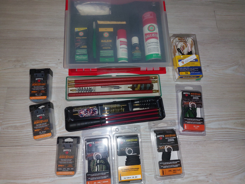 Waffenpflegeset: bestehend aus Flinten- & Büchsenputzstock mit Bürsten, Ballistol Öl, Robla Solo und Schaftöl, Brünnierung. Hoppes Boresnake in den Kalibern 12, 375, 8mm, 7,62 mm, 7mm, 6,5mm, 6mm & Cal. 22