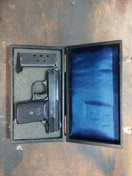Es steht eine Röhner "Autom.Pistole"Model SM 10 KAL 8mm, schwarz, brüniert zum Verkauf. Die SSW war im Erstbesitz einer Person und stammt nun aus dem Nachlass. Dazugehörig ist eine selbstgebaute Schatulle, die das gute Stück schön beherbergt.