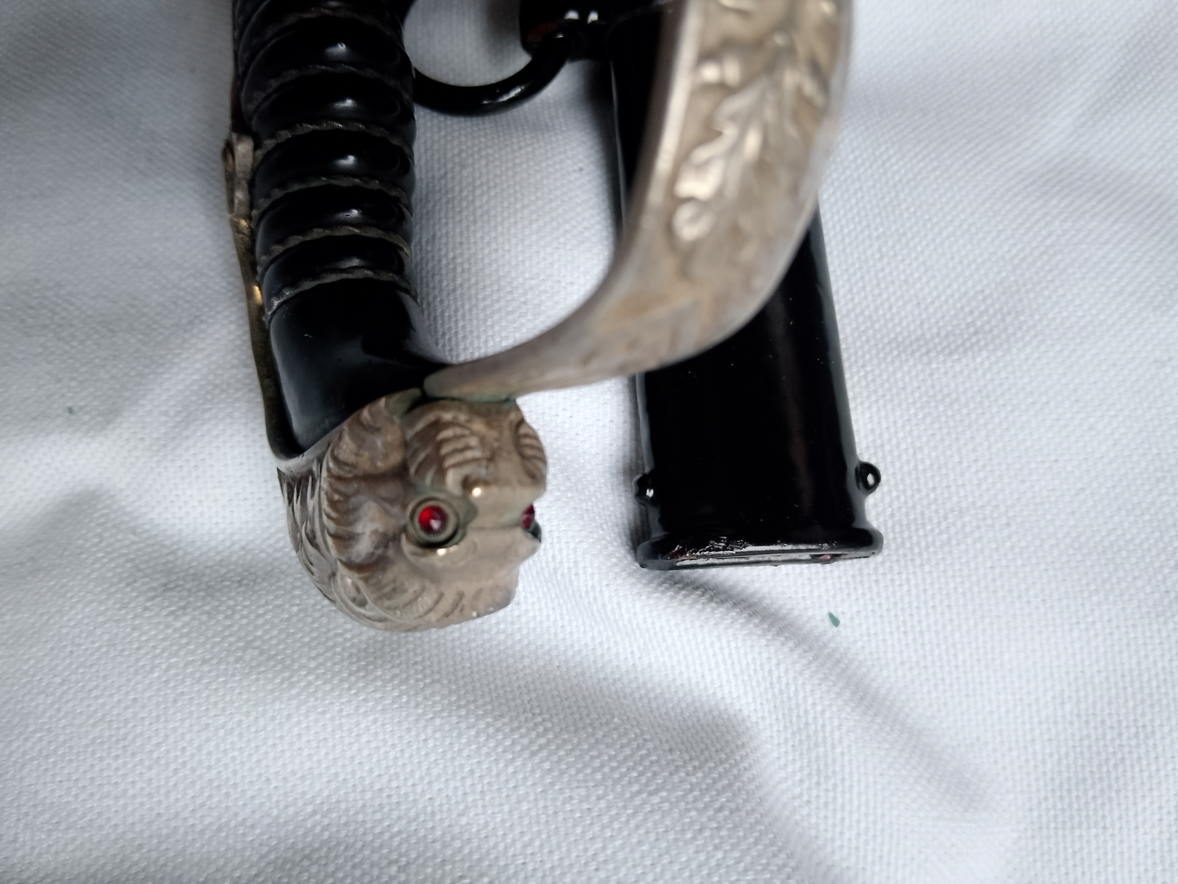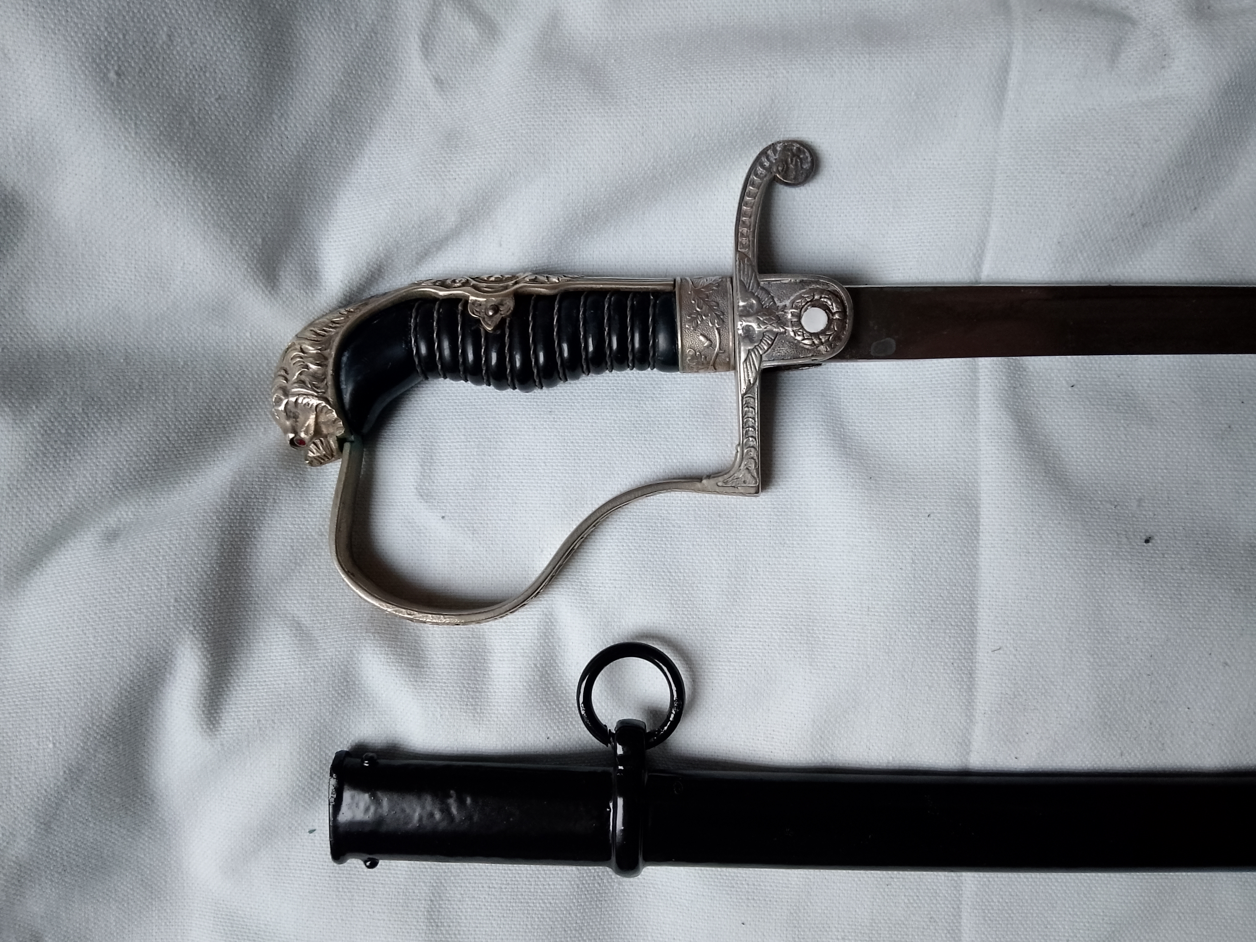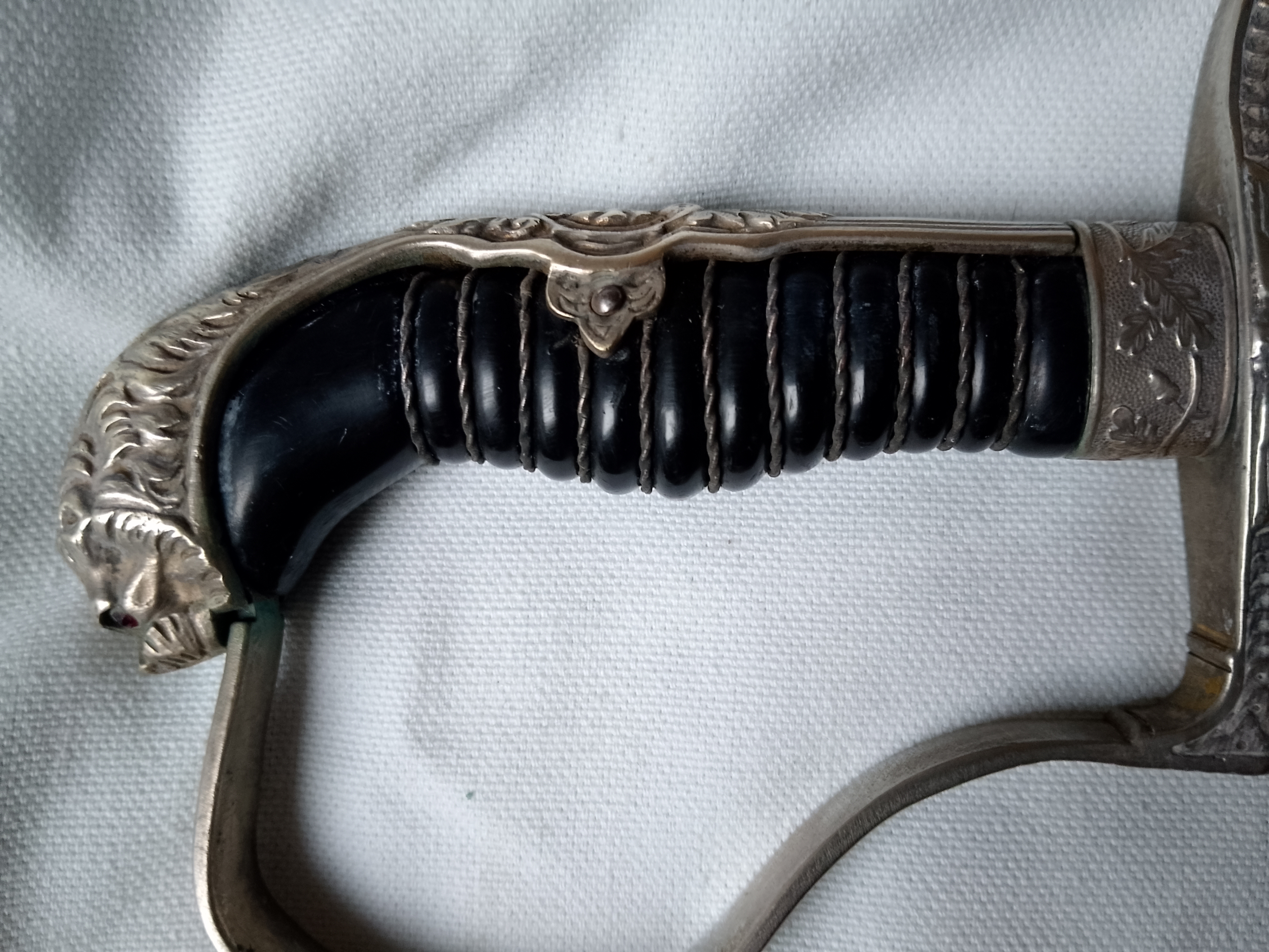 sehr seltener früher löwenkopf bzw Paterkopf Säbel aus dem Hause Lüneschloss Solingen, Gefäß mit vorderseitig sehr schönem frühen Parteiadler, das ganze Gefäß ist versilbert Griff mit Griffwicklung intakt guter bis sehr guter Zustand des Gefäßes, zwei gefasste Rothe Augen.