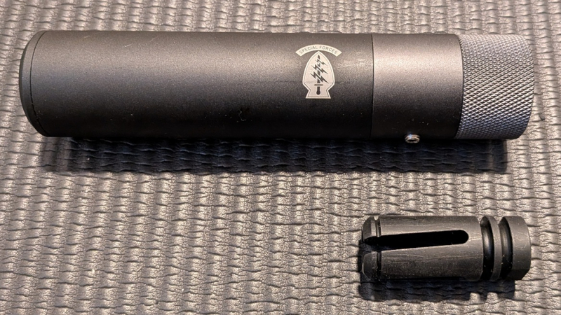 Hochwertiger Nachbau eines echten Schalldämpfers, kommt mit einem passenden 4-Prong Flashhider aus Stahl