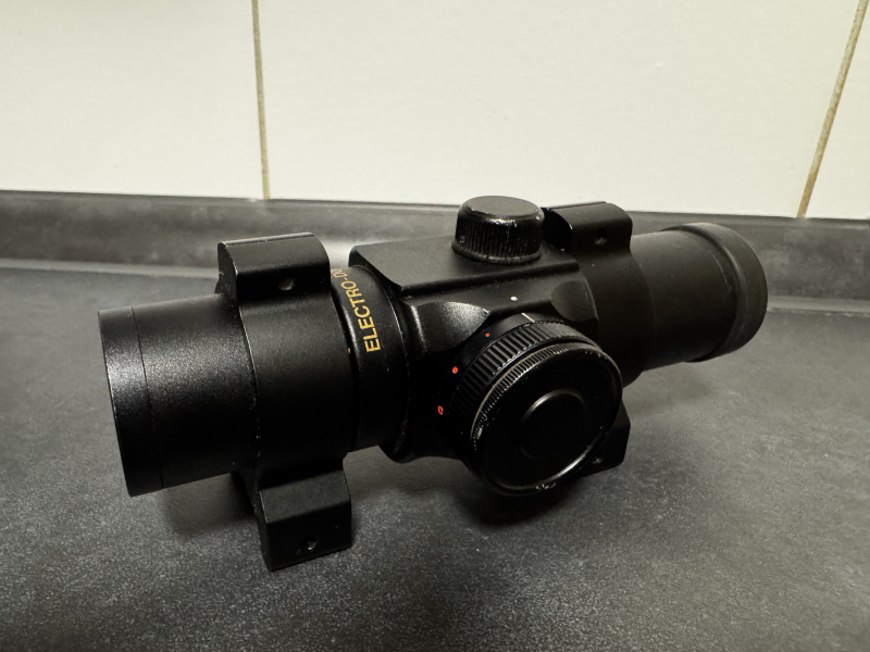 Das Rotpunktvisier weist oberflächliche Gebrauchsspuren auf, ist aber insgesamt in einem guten Zustand. Es ist voll funktionsfähig.