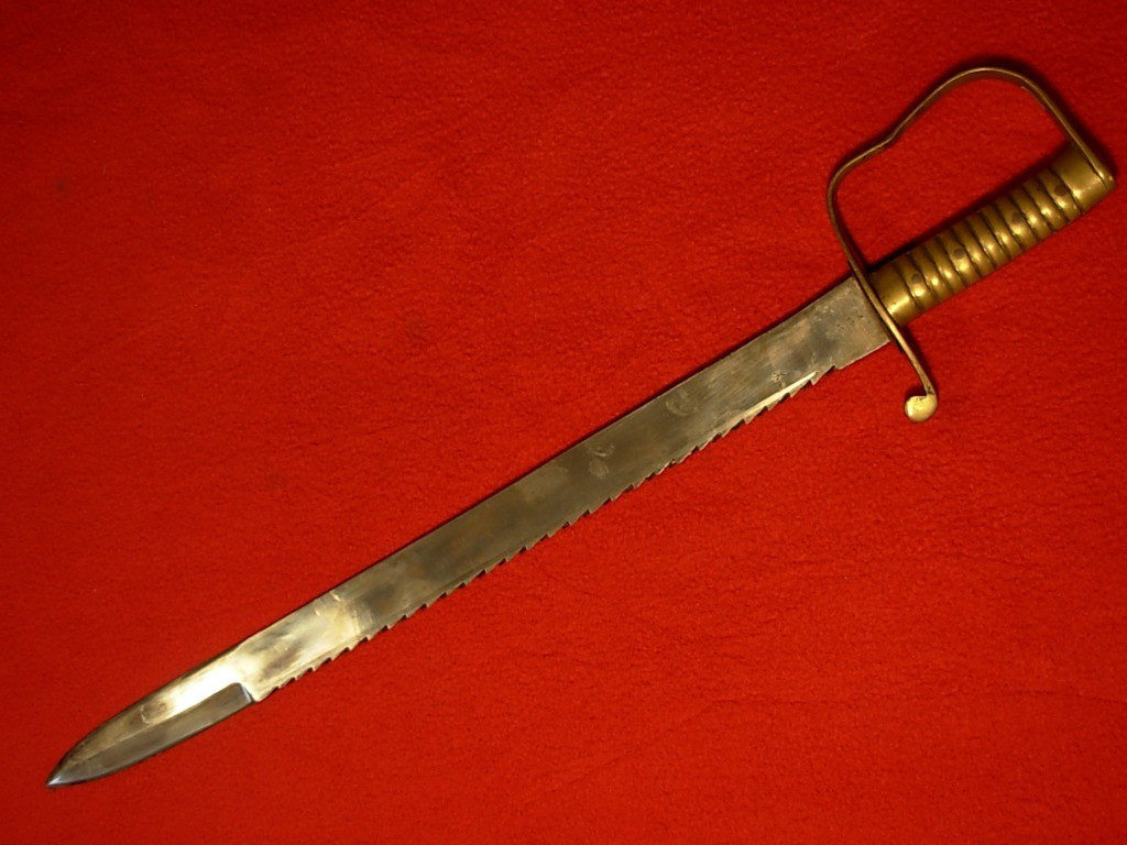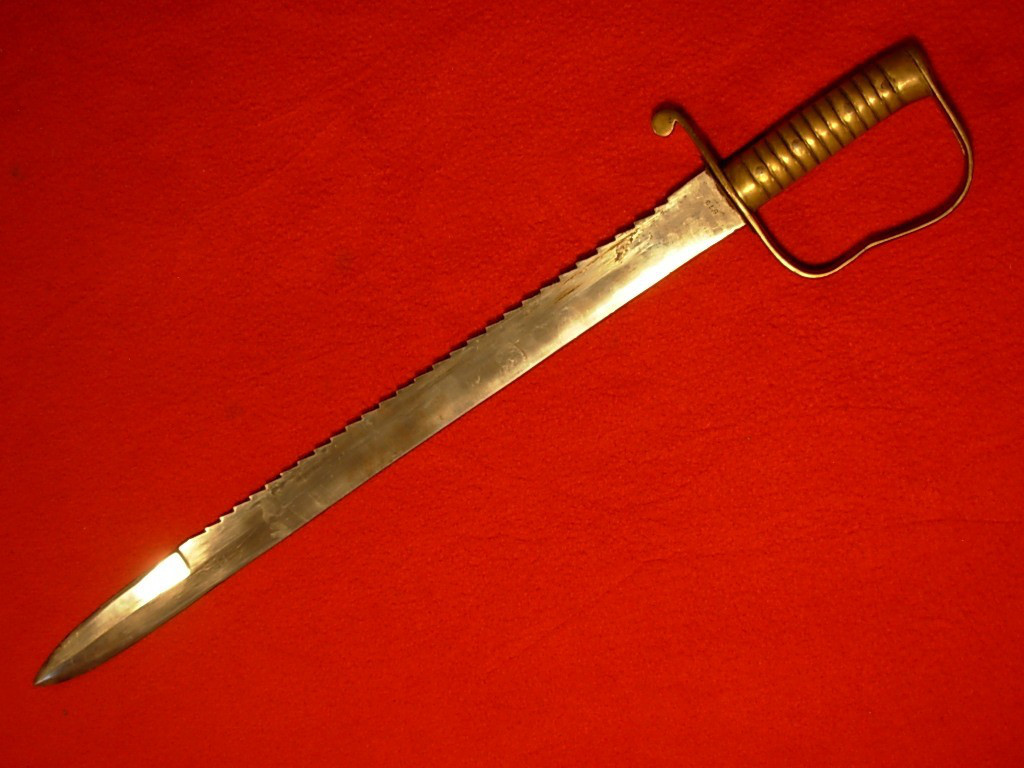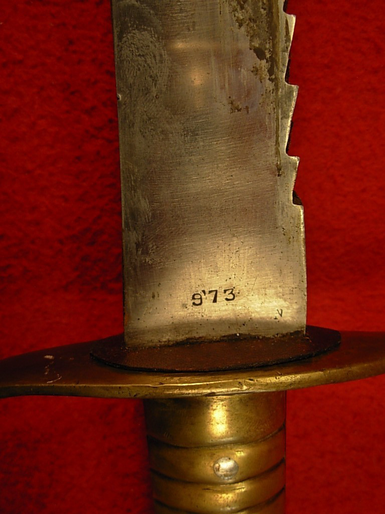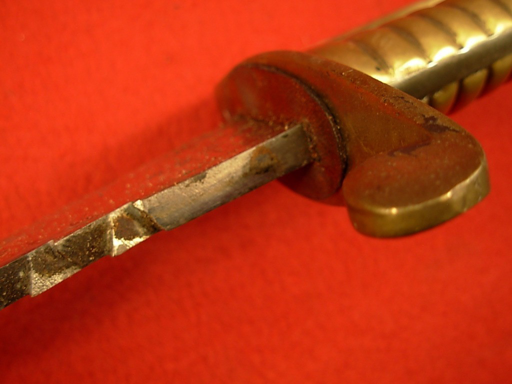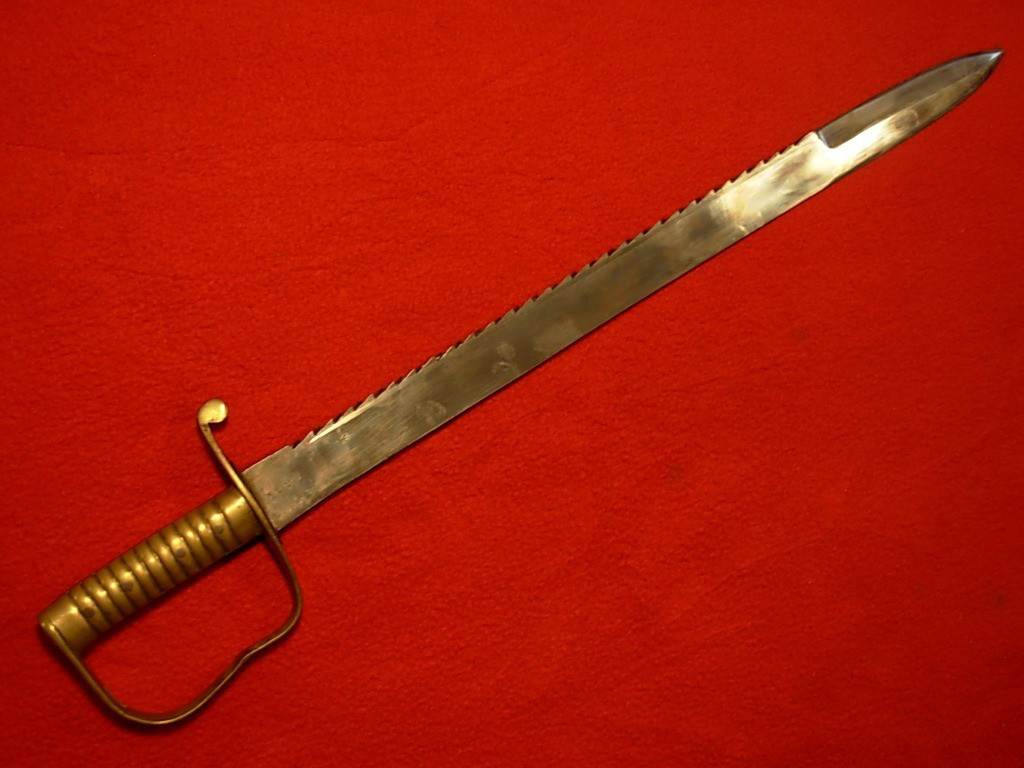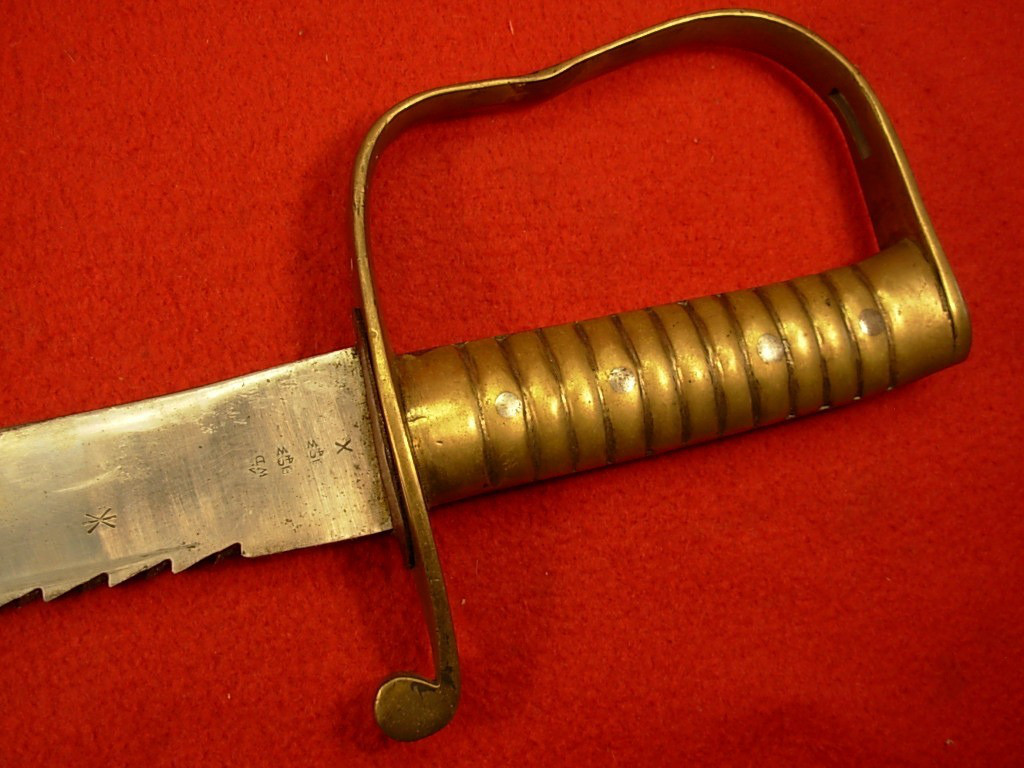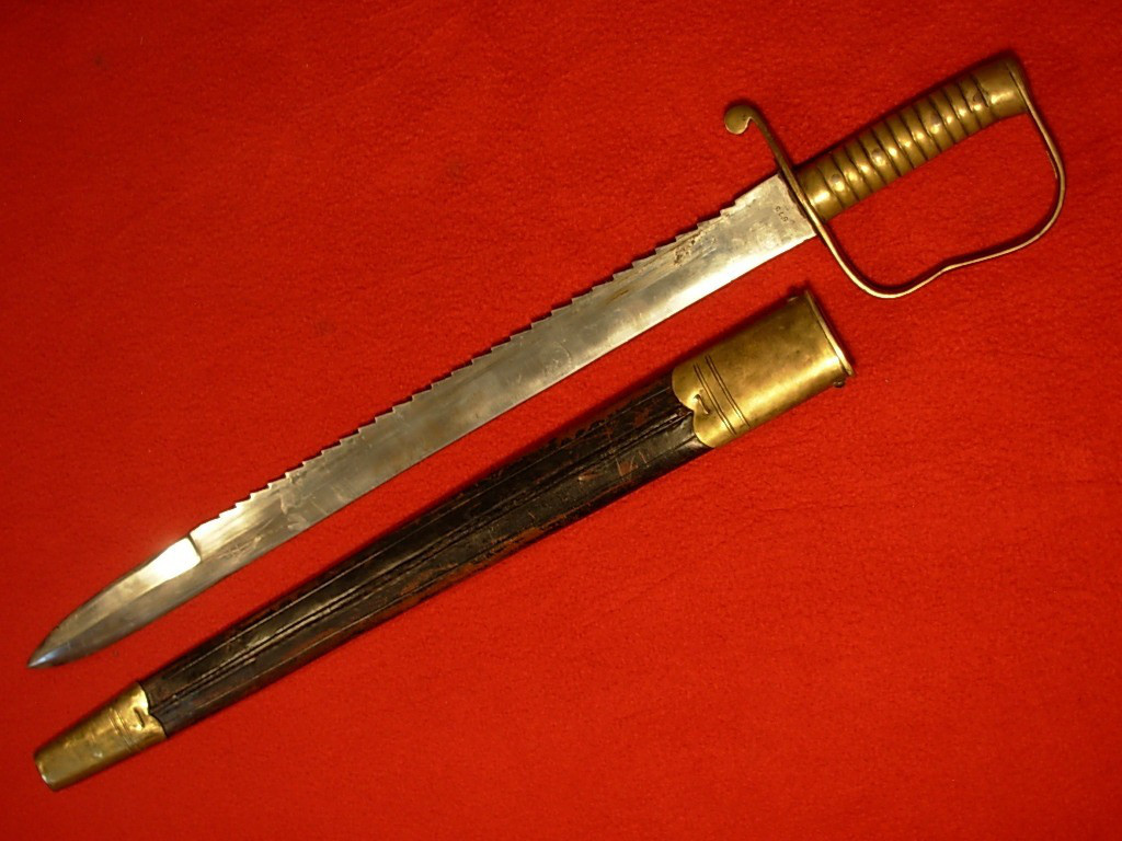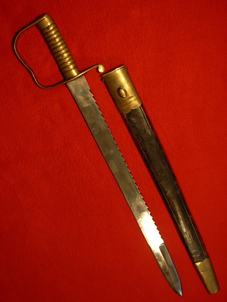 Faschinenmesser mit Sägerücken – England ? – Lederscheide mit Messingbeschlägen – Klinge gestempelt –