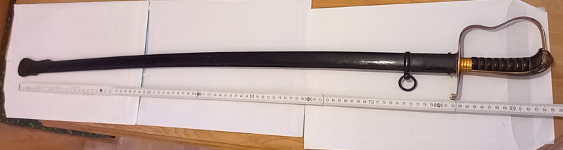 gut erhaltene letzte Ausführung um 1910 ,Klinge von Eickhorn mit Devise in Treue fest, Gesamtlänge 96cm Klingenbreite 22mm Scheide ist noch original lackiert mit Kratzer keine Dellen