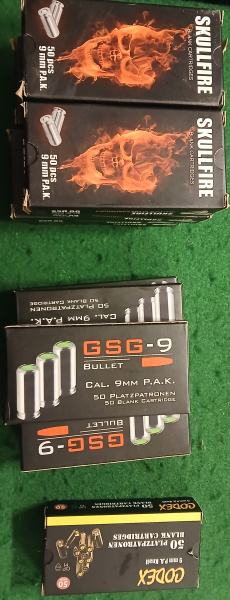 Verkaufe hier 750 Schuss 9mmKnall Patronen von 3 verschieden Herstellern.