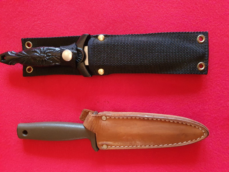 1x Stiefeldolch, 70er Jahre mit oliv-grünem Kunststoffgriff, Lederscheide mit Clip. Gesamtlänge: ca. 23,0cm, Klinge: ca. 12,5cm