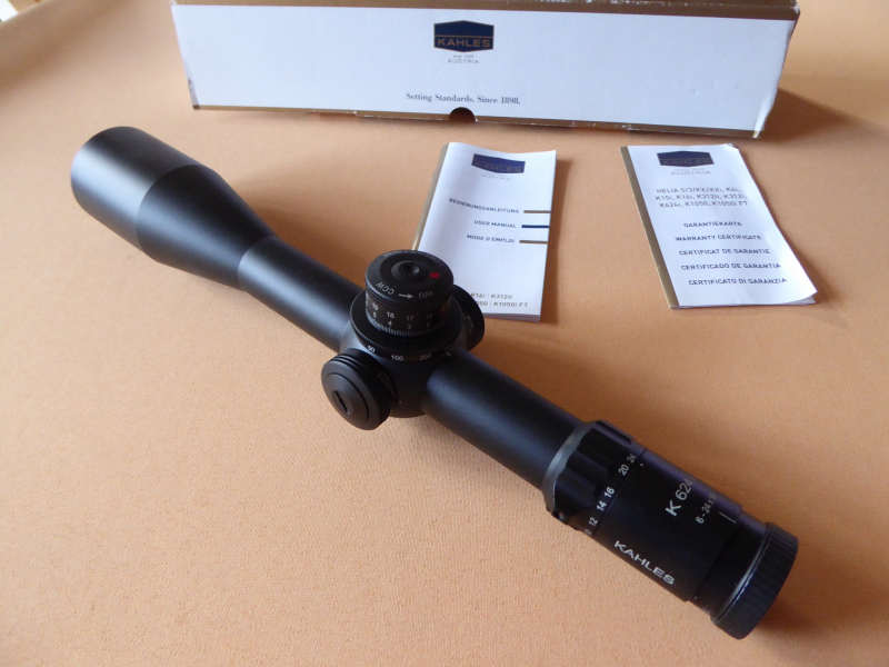 hier wird ein Kahles Zielfernrohr Modell 624, Absehen AMR, Vergrößerung 6-24x56. Klickverstellung 1cm auf 100m. Perfekt zum Longe Range Schießen. Verschickt wird Versichert bis 2.500 Euro, Versand nach EU mit tatsächlichen Kosten.