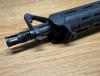 Der Lauf ragt nur so knapp über den Kornträger hinaus wie nötig. Daher erreicht er ganz knapp nicht die 40 cm. Ein Erwerb ist für Sportschützen somit leider nicht möglich. An der Laufmündung ist ein MFD mit der Schnittstelle für die Schalldämpfer von Oberland Arms angebracht. Die Kunststoffteile sind von Magpul, nur der Hinterschaft ist ein MilSpec A2 auf einer Rifle Buffertube. Am Vorderschaft habe ich unten eine Aufnahme für einen einfache Riemenbügel angebracht. Der Abzug ist MilSpec. Die doppelseitige 60-Grad-Sicherung ist von OA.