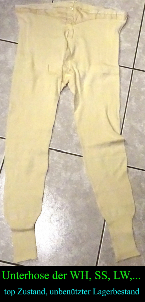 tolles Stück Zeitgeschichte denn diese Unterhosen hatte seinerzeit jeder Soldaten getragen bzw. ein 2. Stück als Ersatz im Tornister. Und obwohl dies seinerzeit jeder Soldat hatte so sind diese originalen Unterhosen aus dem WK2 nur mehr sehr sehr selten zu finden; dies hat damit zu tun, dass diese Unterhosen irgendwann mal verschlissen waren oder auch durch zeitgemäßere Modelle ausgetauscht wurden und somit die alten Bestände wegeschmissen wurden. So sind diese originalen WK2 Unterhosen nur mehr sehr selten zu finden;