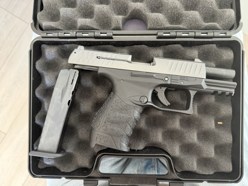 Verkaufe meine (Schreckschuss) Walter PPQ von umarex da sie nicht mehr gebraucht wird sie hat vorne rechts am Schlitten eine minimale macke durchs anecken sonnst Einwand frei mit der waffe wurde kein ganzes Magazin verschossen