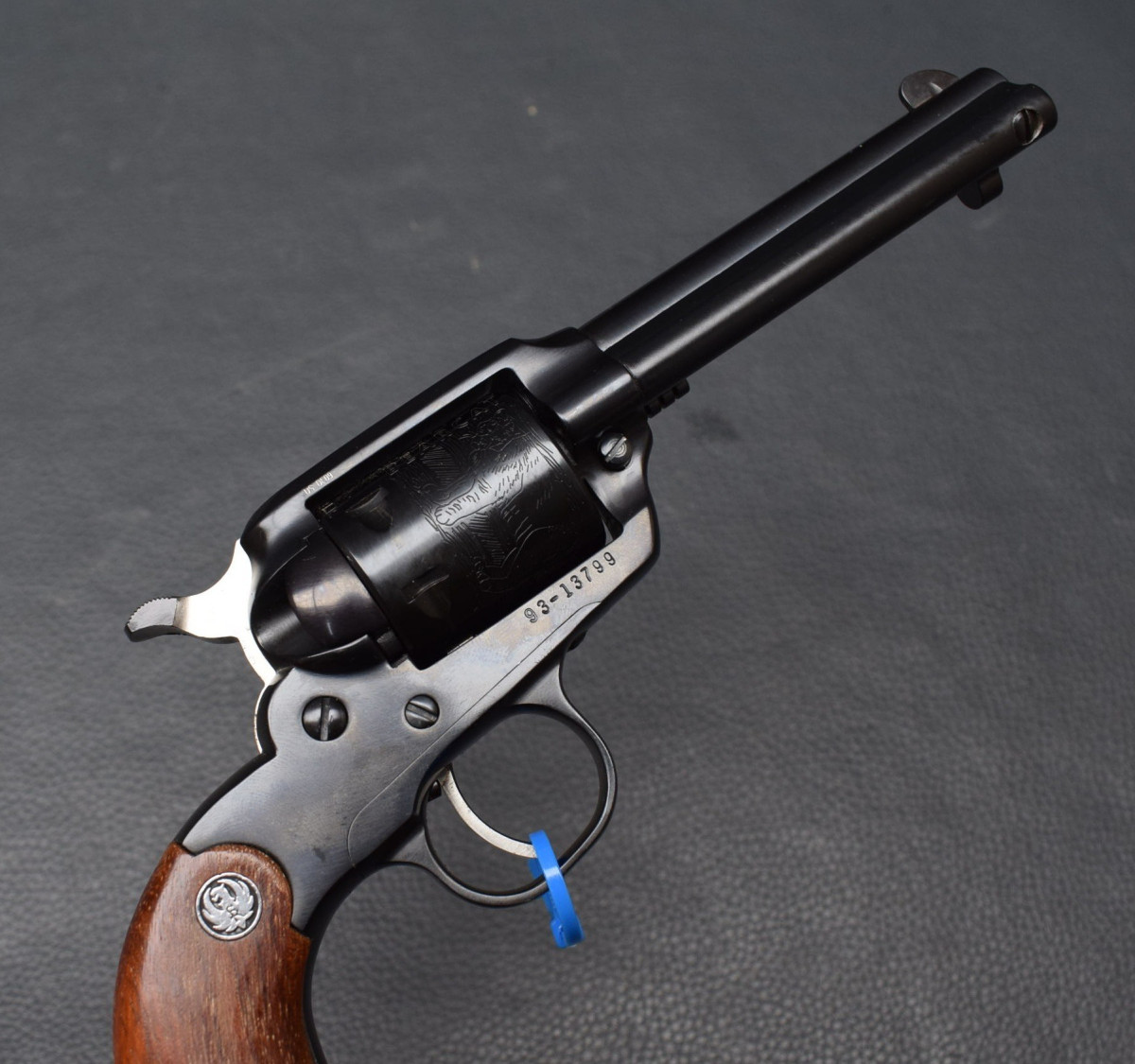 Holzgriffschalen mit Ruger Logo. Lauf und Trommelbohrungen sehr gut, Brünierung 97%