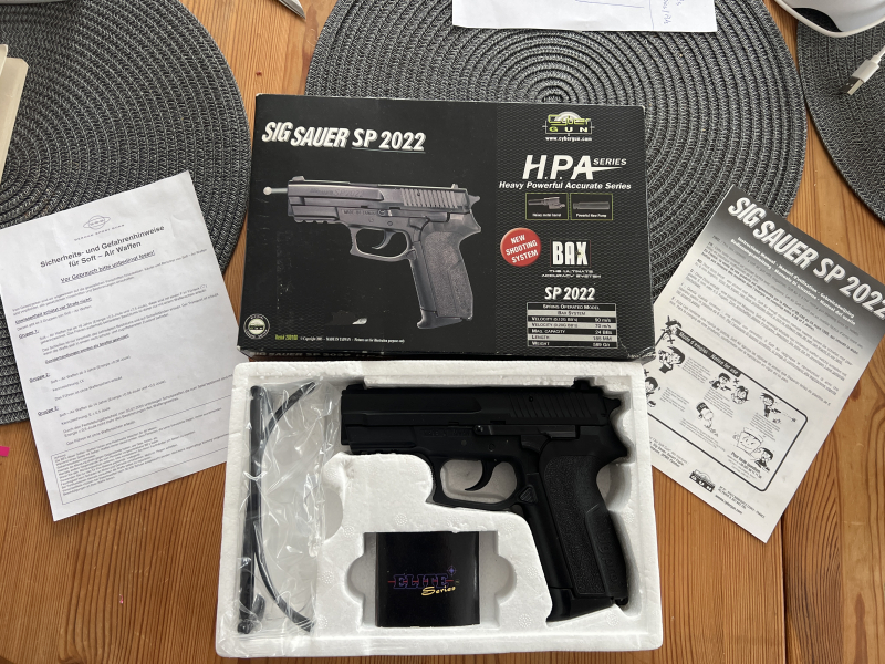 Sig Sauer SP2022 - ein weiteres Modell aus der erfolgreichen H.P.A. Serie im Kaliber 6mm BB. H.P.A. steht für H-eavy P-owerful A-ccurate und bedeuted, dass es sich hier um einen 1/1 Nachbau handelt der eine sehr starke Schussleistung besitzt. Die Nachfertigung besitzt einen präzisions Metall-Innenlauf sowie ein sehr strapazierfähiges Innenleben mit PNP-System. Das PNP-System ist mit einem besonders gut abdichtenden Piston ausgestattet, der für eine gleichbleibende Schussenergie sorgt.