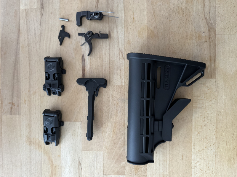 Ich verkaufe ein Konvolut Originalteile von Tippmann. Enthalten ist der Abzug, der Ladehebel, die Flip Ups und der Hinterschaft.