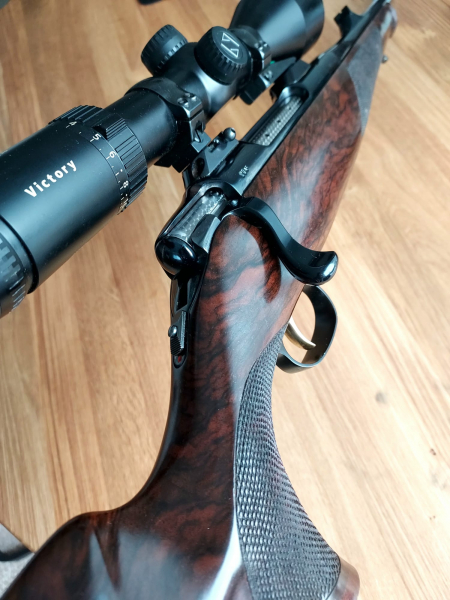 Der exklusive Schaft wurde damals unüblicher Weise (Exklusiv/Custom) als Holzkantel ab Werk ausgesucht und sucht seines gleichen. Die Gesamtlänge beträgt ca. 103cm, der Abzug ist goldfarben und es befindet sich ein Sonnenschliff auf dem Kammerstengel. Mittels EAW/Sauer Schwenkmontagen ist ein Zeiss Varipoint 2,5-10x50 T* montiert. Gebrauchsspuren kann ich persönlich keine feststellen, Interessenten dürfen sich vor dem Kauf aber gern selbst davon überzeugen. Die Schussleistung ist mit RWS ID-Classic ausgezeichnet, geschossen worden ist sie allerdings extrem wenig. Preisvorschläge willkommen!!