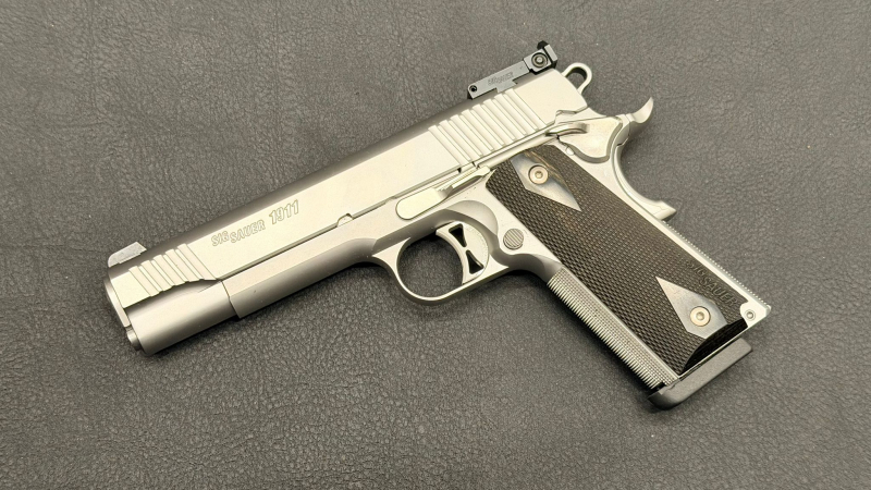 Halbautomatische Pistole SIG Sauer Mod. 1911 im Kaliber .45 Auto. Klassisches 1911-Design mit matter Oberfläche, skelettiertem Abzug und Hammer. Die Pistole ist voll funktionsfähig und befindet sich in gutem Allgemeinzustand. Lieferung im Originalkoffer inklusive abgebildeten Zubehör. Sehr angenehmer Abzug mit 1100g Abzugsgewicht.