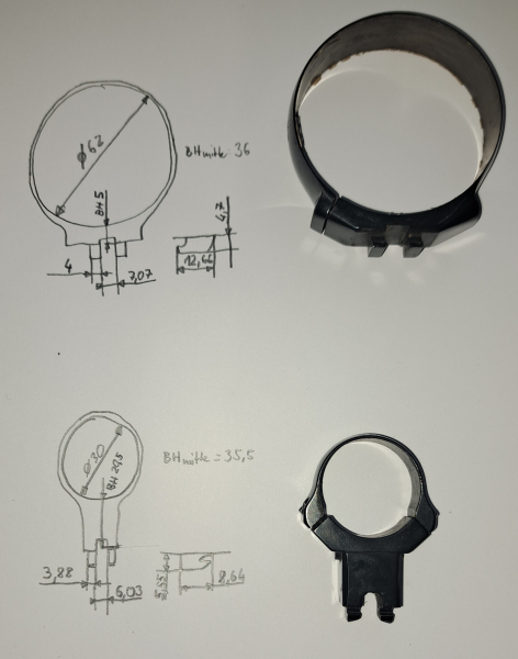 Biete Oberteile einer Suhler Einhakmontage an. Objektivringinnendurchmesser ist 62mm (für Gläser mit 56mm Objektivlinsendurchmesser). Hinterer Ring hat 30mm Innendurchmesser(für Gläser mit 30mm Mittelrohrdurchmesser). BH mitte des Glases zu Anlagefläche Platte/Schlösschen ca. 36mm für den Objektivring und 35,5mm für den hinteren Ring. Dadurch sollte eine Montage möglich sein wenn ihre vordere Platte für die Füsschen mit der Schlösschenoberfläche in einer Linie also ohne paralellen Versatz sind. Alle relevanten Masse auch von den Füsschen im ersten Bild. Hinteres Oberteil leichte Rostflecken. Die Platte und Kimme im Bild gibt es gratis dazu. Die Platte passt nicht zu den Füsschen des Objektivringes, bitte beachten!!!!