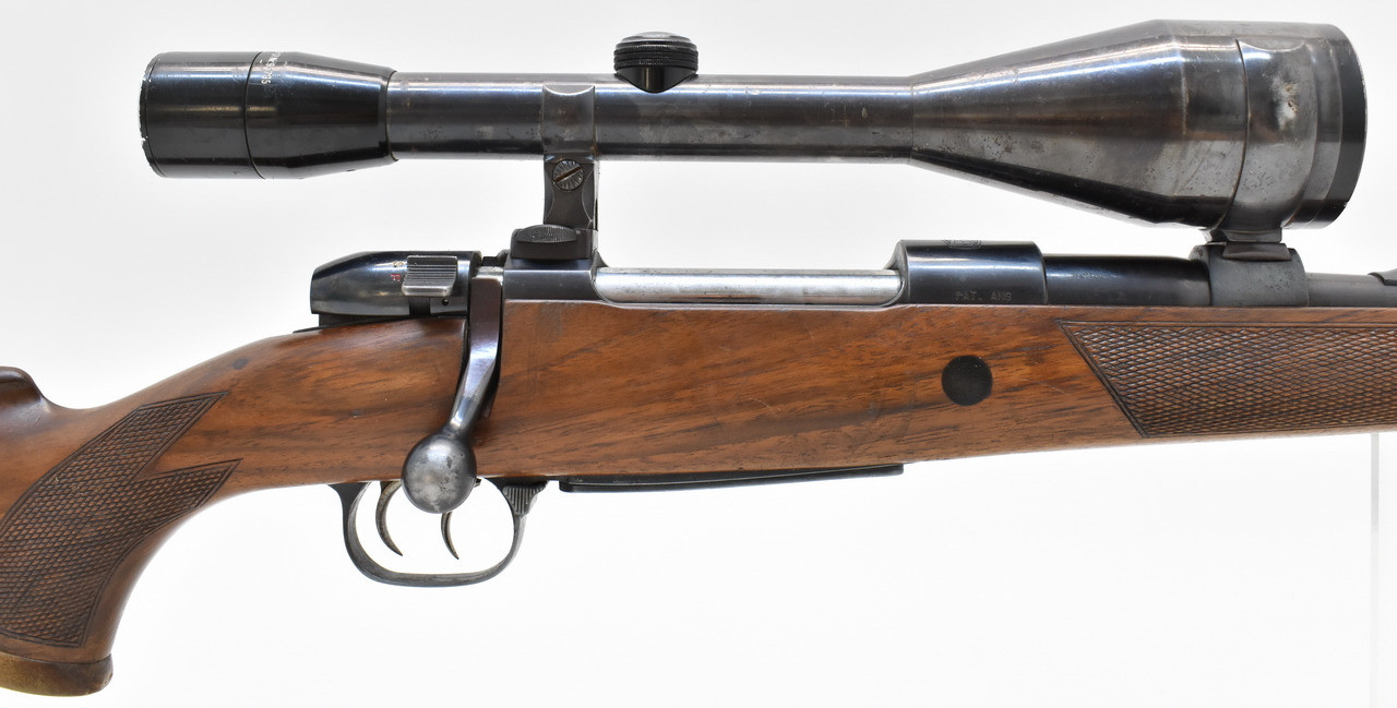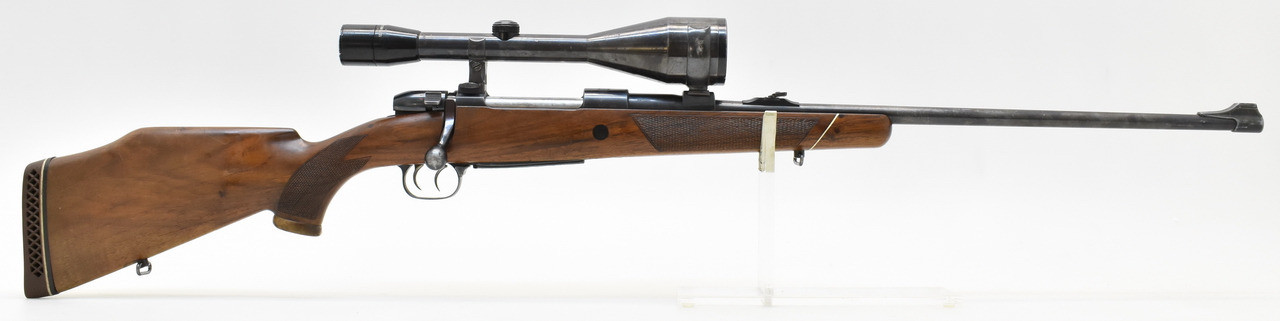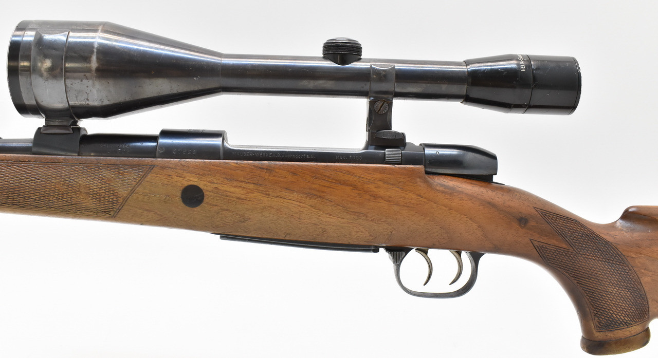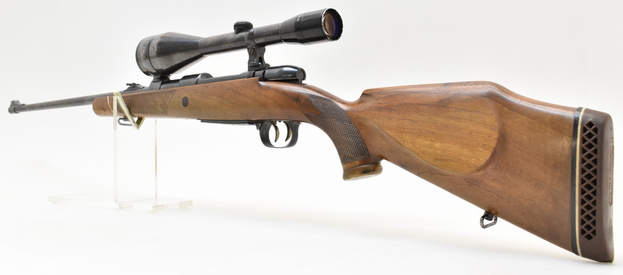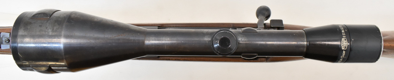 Jagdrepetierer mit deutschem Stecherabzug, seitlicher Sicherung und Klappdeckelmagazin für 4 Patronen. Der Lauf ist blank, die Brünierung stark berieben. Montiert mittels einer SEM ist ein Kahles Zielfernrohr Helia Super 8x56. Die Durchsicht des Glases ist leicht gelblich. Schaftlänge 38cm ( gemessen vorderer Abzug bis Mitte Schaftkappe)