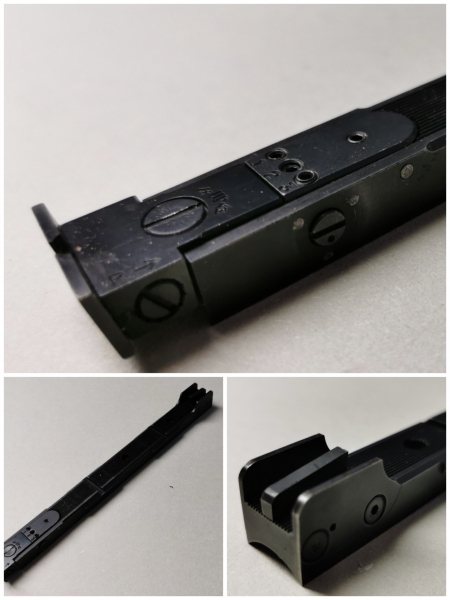 eine Visierschiene mit 3 Positionen . Die Schiene verfügt ebenfalls über eine Möglichkeit zur Anbringung von optischen Visieren, ebenso lassen sich die Kornschutzflanken entfernen falls dies erforderlich ist. Passend für S & W Revolver in 6 Zoll. Bitte Details im einzelnen den Bilder entnehmen.