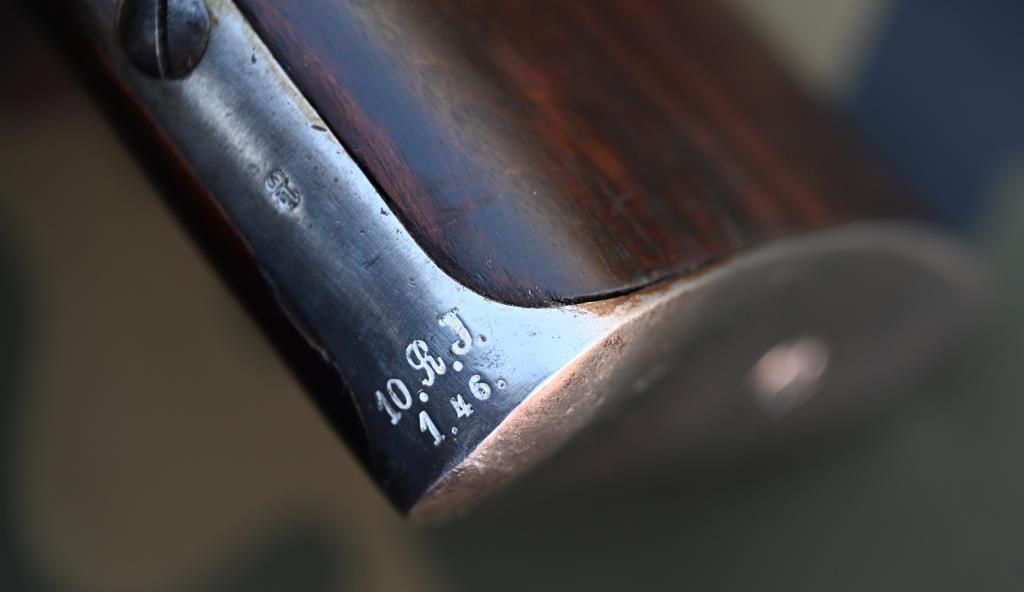 Kaliberangabe „11“, Modellbezeichnung „I.G. Mod. 71“, Herstellerschriftzug „GEBR. MAUSER & Co OBERNDORF", "W" unter Krone auf Hülse, diverse alte (gültige) deutsche Beschusszeichen (kein Neubeschuss) und viele gothische Prüfzeichen, Baujahr "1876" sowie Jahr der Indienststellung „1884“ rechts auf der Hülse.