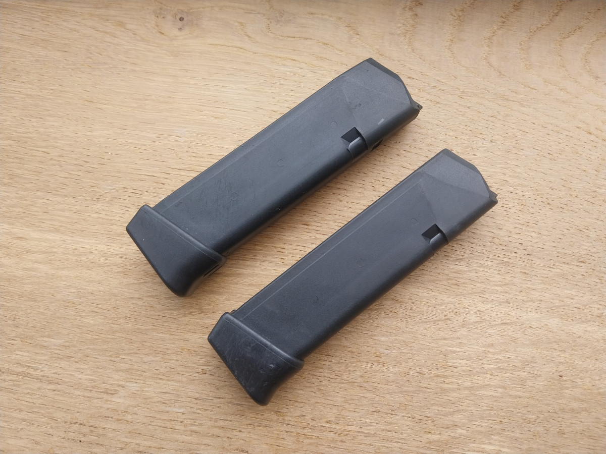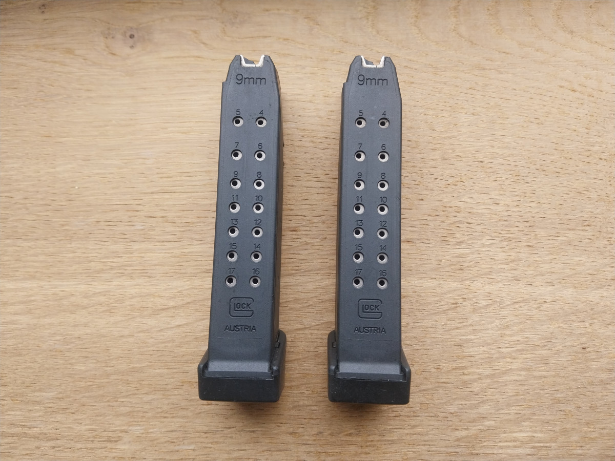 Zum Verkauf kommen meine beiden Glock 17 Magazine mit verlängerten Magazinschuh. Das Magazin kann so 2 Patronen mehr aufnehmen. Beide Magazine besitzen geringe Gebrauchsspuren, sind jedoch zu 100% funktionstüchtig.