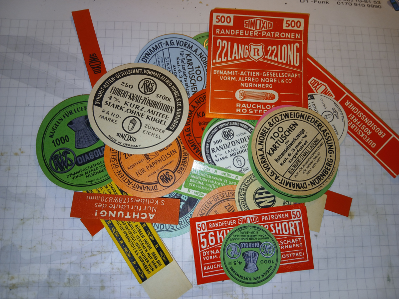 Biete aus "Alter Druckerei in Nürnberg" 38 Stück Verschiedene Aufkleber von Alten Patronen-Schachteln (Sehr Selten)