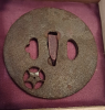 Tsuba aus Eisen für ein japanisches Katana. Schön durchbrochen mit Blütenmotiv gearbeitet, flächig Strahlenmuster. Mit deutlichen Montagespuren und Altersspuren, teilweise rostig bzw. rostnarbig. Durchmesser 7,9 cm. Mit gepolsterter Holzbox.