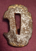 Tsuba aus Eisen für einen japanischen Tanto (Dolch), schöne und interessant gearbeitet Arbeit mit unregelmäßigem, „organischem“ Muster, daher die uneinheitliche Oberfläche, mit Verzierungen aus Messing oder Gold. Mit deutlichen Montagespuren und Altersspuren, teilweise rostig bzw. rostnarbig. Durchmesser 5,0 x 3,4 cm. Mit gepolsterter Holzbox.