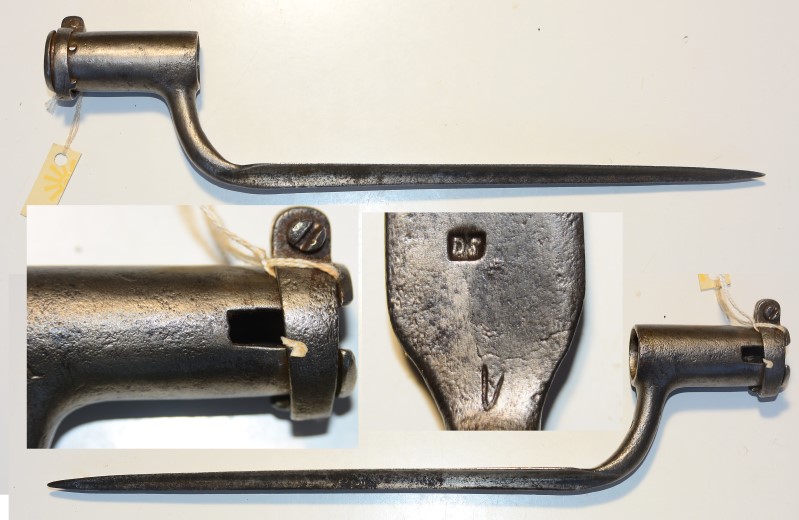 Kurzes Tüllenbajonett mit einfacher Befestigung, vor 1800, Klinge 24 cm, gestempelt "DS", fleckig bis leicht rostig