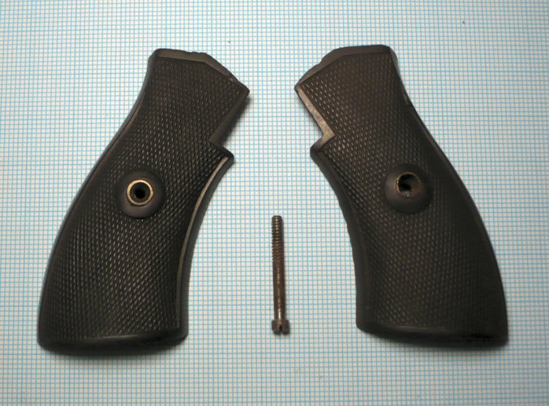 Griffschalen für einen kleinen Revolver(Typ unbekannt). Holz mit Befestigungsschraube. Guter Zustand mit einigen Gebrauchsspuren.