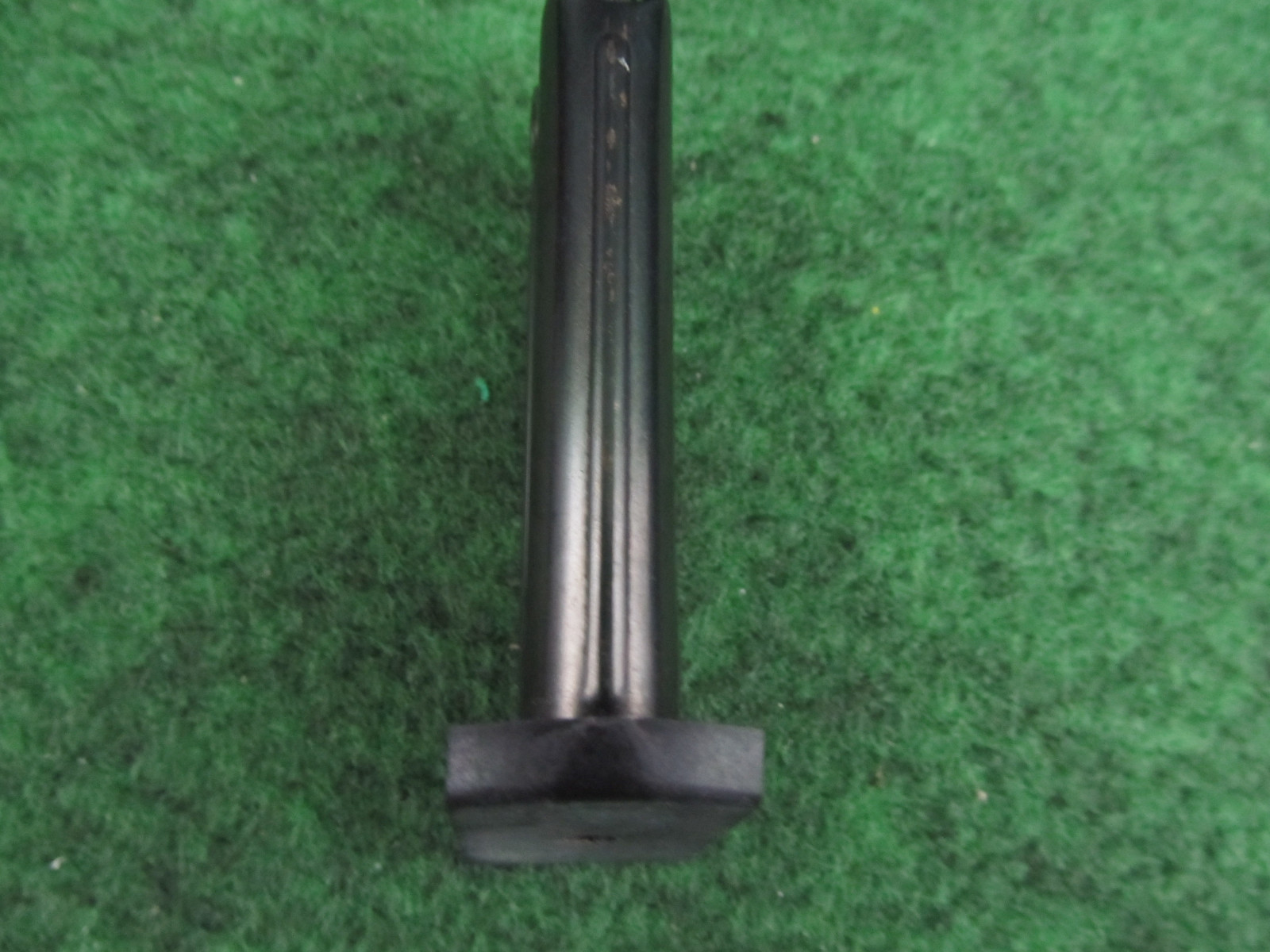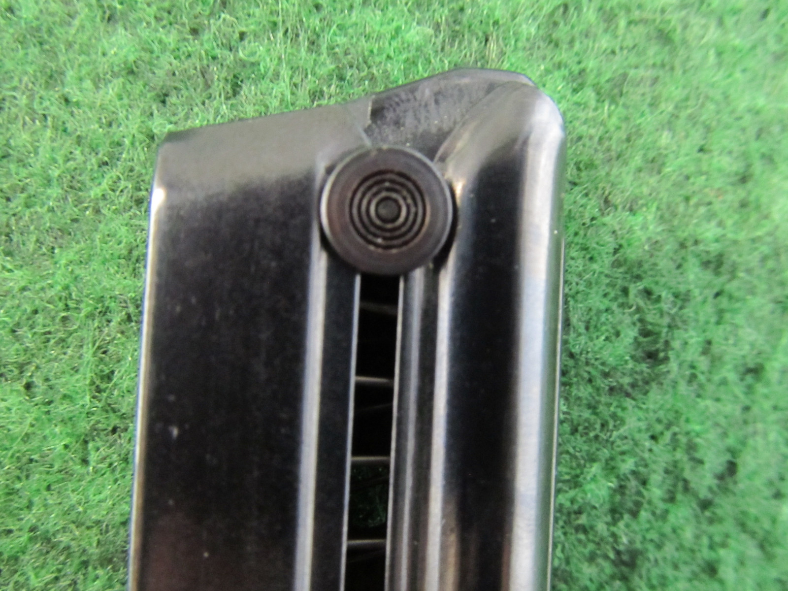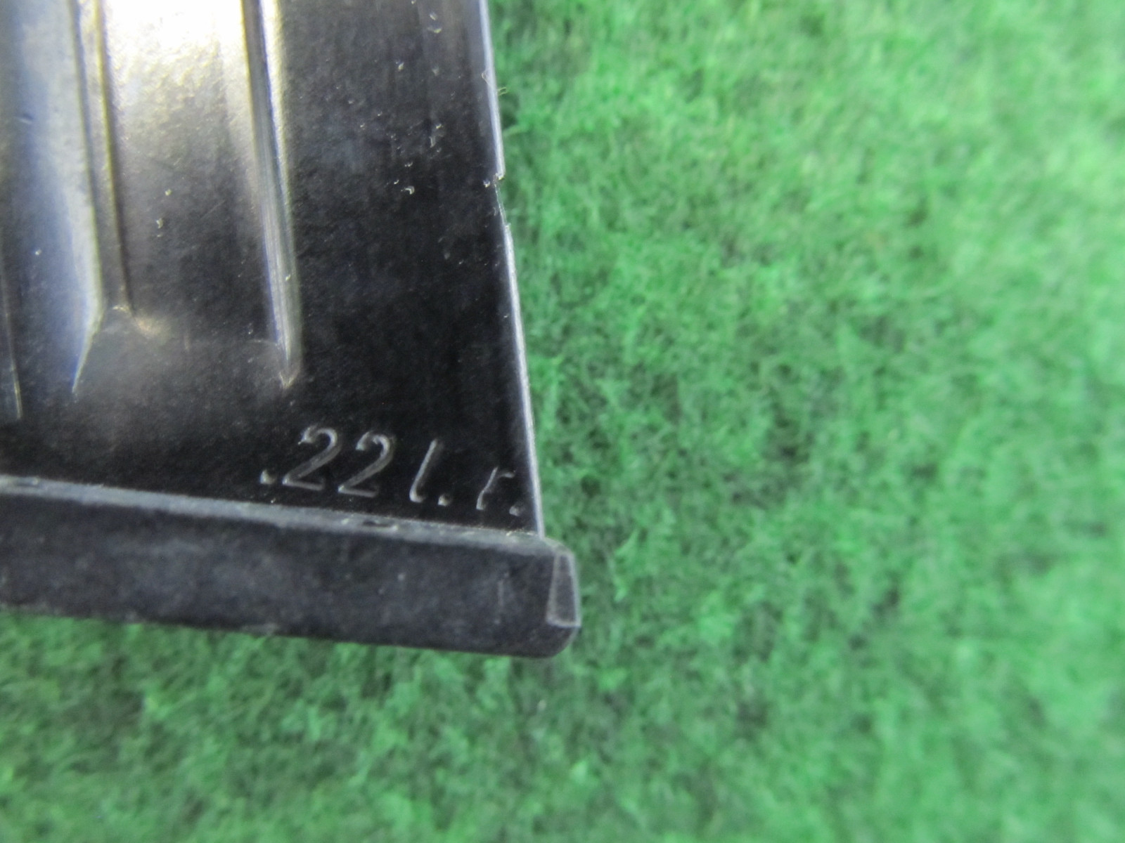 Das Magazin befindet sich in einem sehr guten Zustand. Es ist auf einer Seite die Walther-Fahne und auf der gegenüberliegenden Seite die Kaliberangabe „22 LR“ gestempelt. Diese Stempelungen sind typisch für originale Walther-GSP-Magazine und gelten als wichtiges Authentizitätsmerkmal. Mit dem Knopf der nach dem letzten Schuss den Verschluss aufhält, ebenfalls lässt sich damit das Magazin viel besser laden. Nach meiner Ansicht befindet sich das Magazin in einem sehr schönen, gepflegten Zustand. Es handelt sich um ein Originalteil, keinen Nachbau.