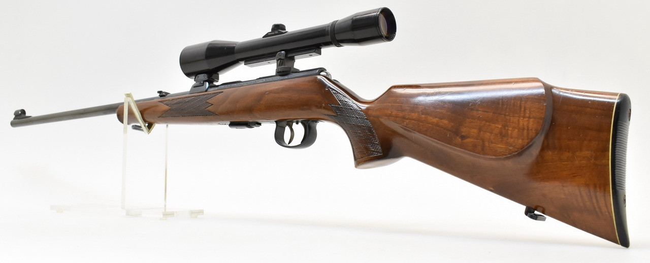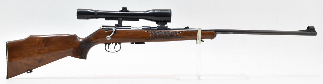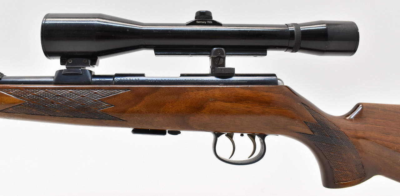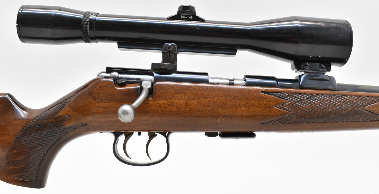 Handliche KK-Büchse mit einem 5-Schuss Magazin und Stecher. Der Lauf ist spiegelblank. Montiert ist die Waffe mit einem Geco Zielfernrohr 6x42 Abs.1 mittels einer Suhler Einhakmontage Ulmer Beschuss von 1973.