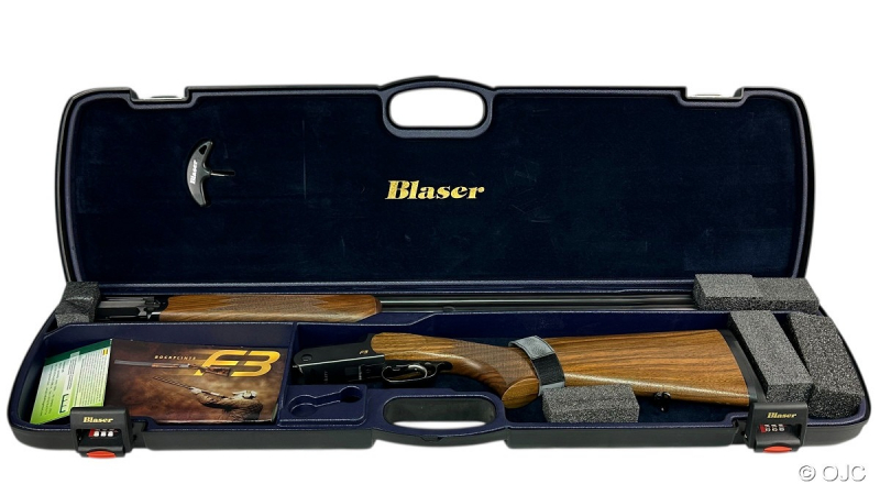 Angeboten wird hier eine Blaser F3 "Game" - Kernelemente der mit einer massiven Keilverriegelung ausgestatteten Bockdoppelflinte sind ein rein mechanischer, selektiver Einabzug mit stufenlos längenverstellbarem Abzugszüngel, ca. 1.400g Abzugsgewicht und die Triplex-Laufprofilierung (flacher Übergangskonus im Lauf und Overbore bei 18,65mm Länge - dies führt zu einer wesentlichen Optimierung von Mündungsgeschwindigkeit, Garbenhomogenität und Rückstoß!). Weiterhin verfügt die Waffe über das EBS-Auswerfersystem, welches die Ejektoren erst beim Öffnen nach dem Schuss spannt.