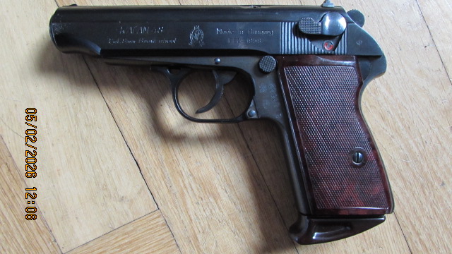 Sehr gut erhaltene Sammlerpistole mit ägyptischem Wappen, Bauzeit 1958-1960, ca. 10200 gefertigt, davon ca. 7000 ausgeliefert, ca. 3000 kommerziell verkauft, alle Kontraktpistolen haben ein „E“ Präfix; Inspektionsstempel „I im Herz“, gültiger Beschuss ist vorhanden; bewährte, sehr präzise, verlässliche und solide Pistole, Magazin für 8 Patronen. Technisch eine Modifikation der Walther PP/PPK.