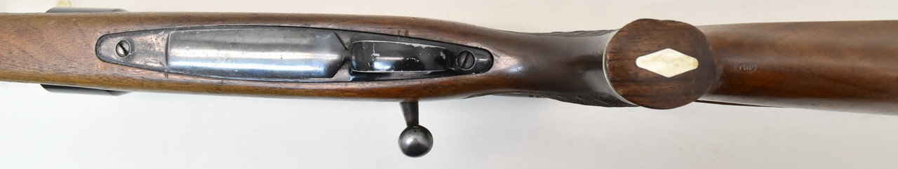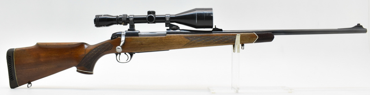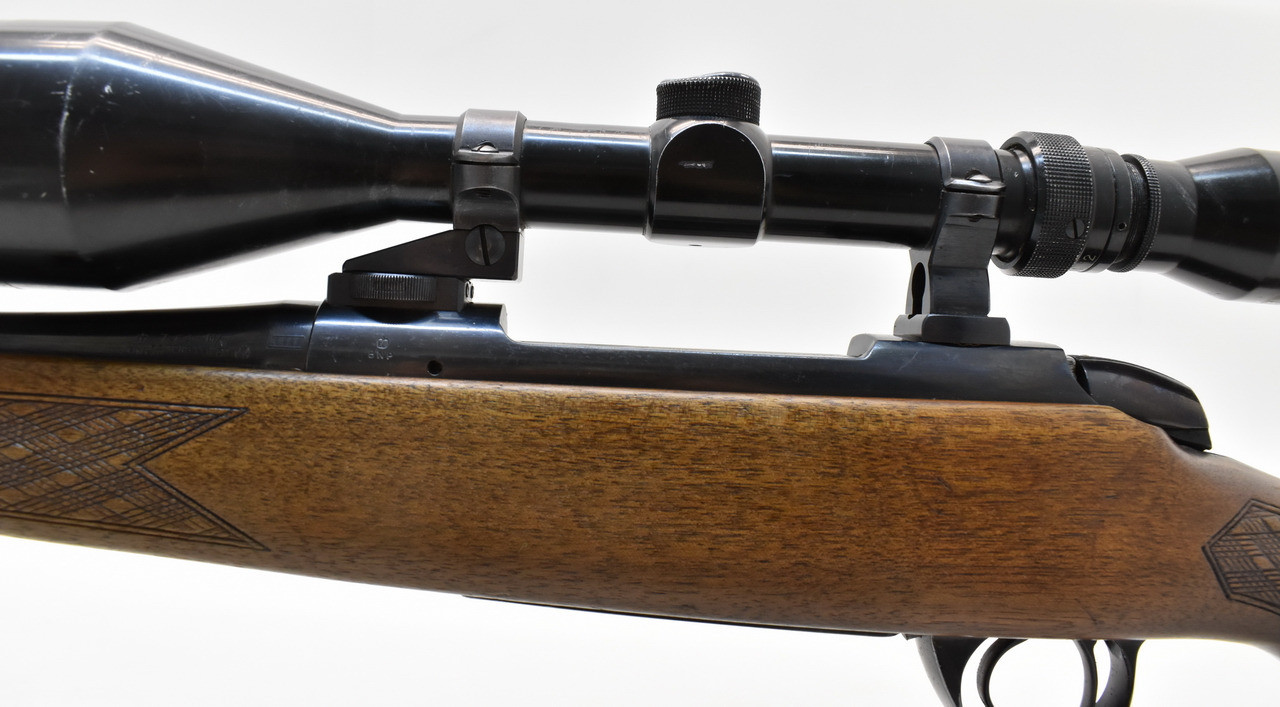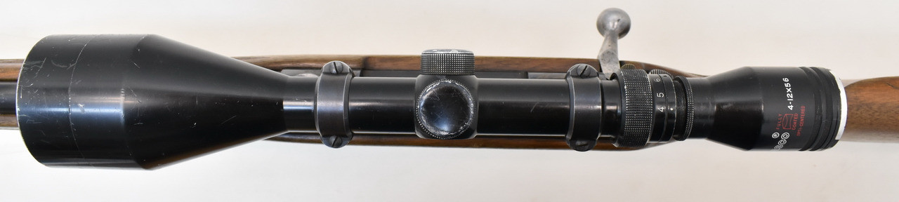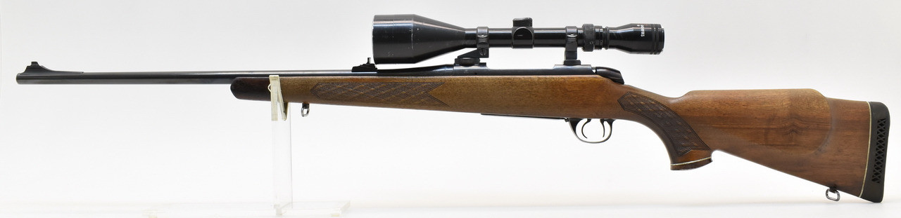 Jagdrepetierer mit spiegelblankem Lauf und Stecherabzug. Das vordere Züngel wird zum Einstechen nach vorn gedrückt. Dunkles Schaftholz mit Backe und Pistolengriff, Schaftlänge gemessen von vorderen Abzug bis Mitte Schaftkappe 38cm. Fühl-und sichtbarer Signalstift oben am Schloss zur "gespannt" Anzeige. Montiert ist ein Tasco 3-12x56 Abs. 1 mittels einer Kontra Einhakmontage.