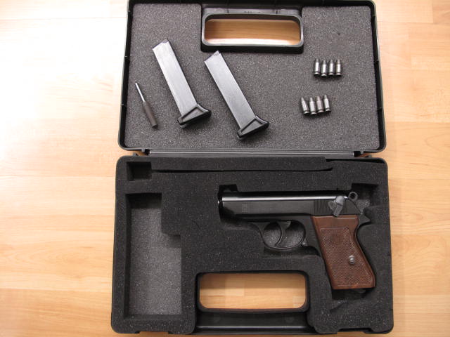 Waffe , 2 Magazine , 8 Ladehülsen , 1 Ausstosser , 1 nicht originaler Koffer von Walther .