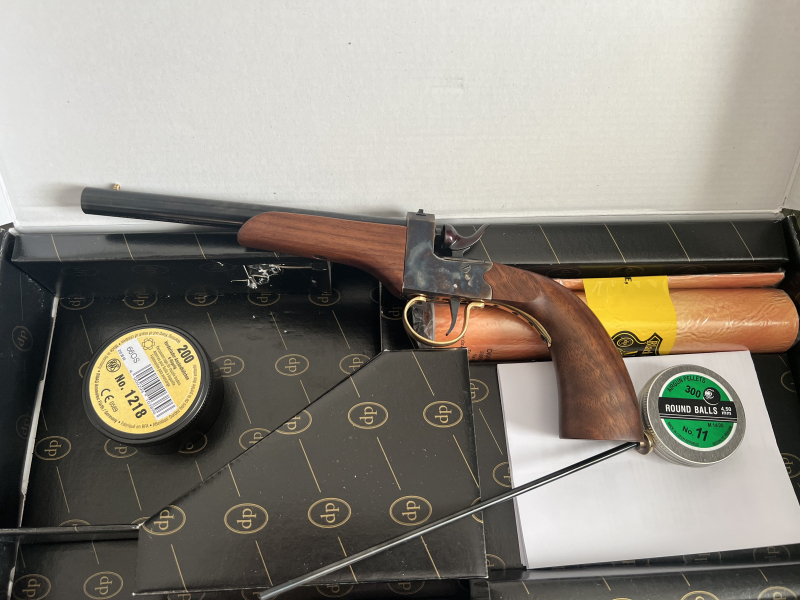 Pedersoli Saloon Pistole im Cal. 4,5mm. Ungeschossen im originalen Karton. Die Waffe wurde vor einem Monat neu bei SWS Schneider gekauft. Kaufrechnung anbei. Eine neue Dose Zündhütchen No. 1218 und eine neue Dose 4,5mm Bleikugeln gehört auch dazu.