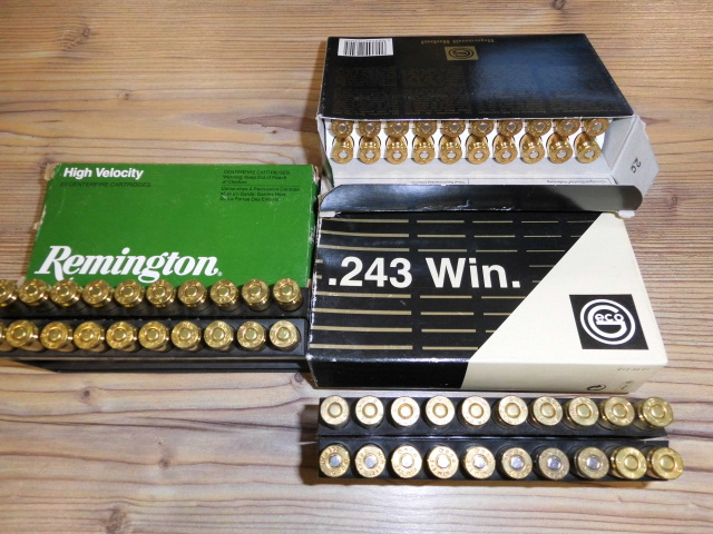 Biete im Auftrag, aus Nachlaß Patronen im Kaliber .243 win - 28 x Geco 105 grn TM Rundkopf und 32 x Remington 80 grn Power Loct HP- siehe Bilder.