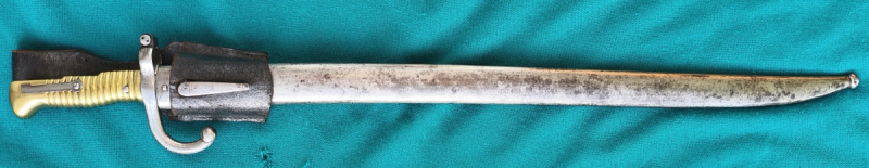 Geschwungene Rückenklinge mit Marken, Parierelement mit Nummer und Stempeln. Gestufter Messinggriff. Strammer Drücker. Eisenscheide mit Abnahmestempel. Orig. Koppelschuh, Rückseite Hersteller. Gesamtlänge mit Scheide 71cm.