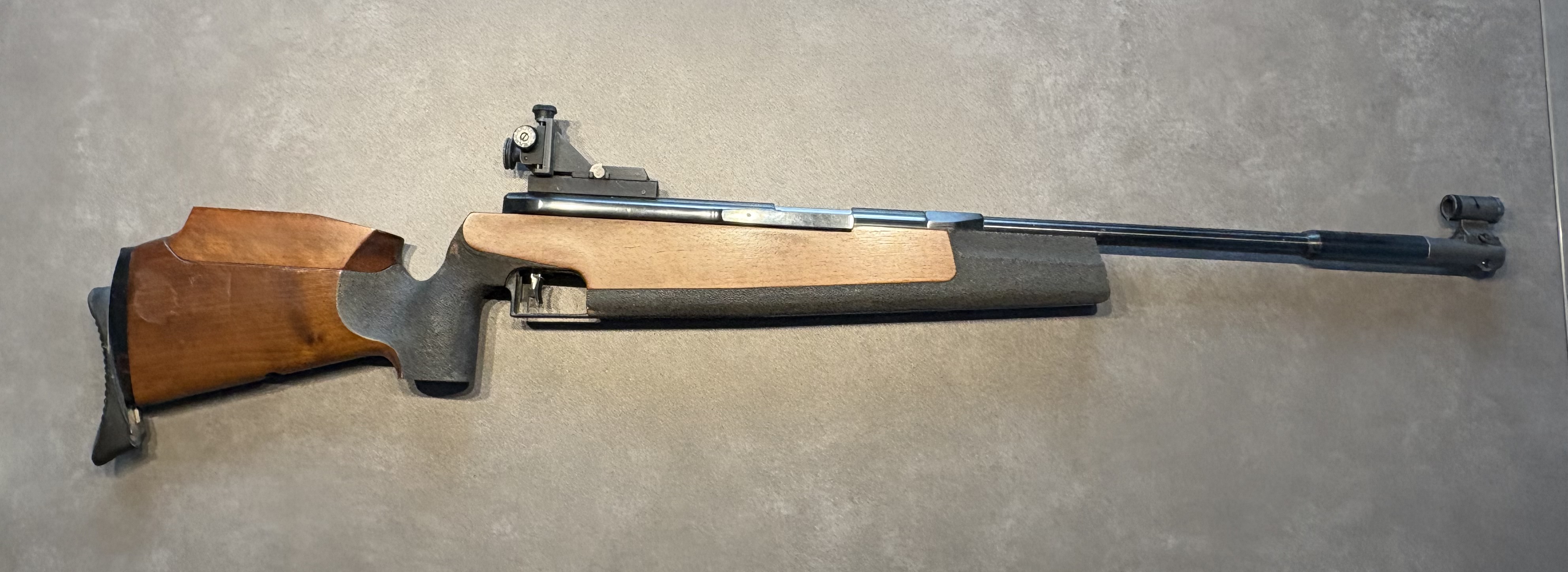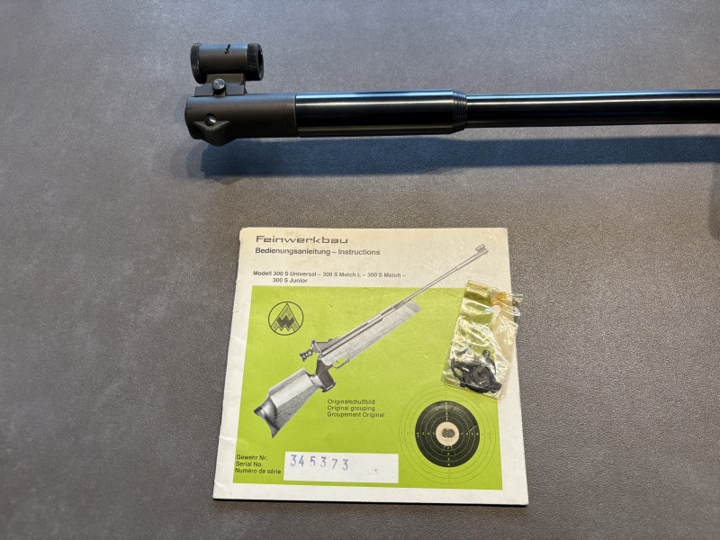 Verkauft wird ein Luftgewehr Feinwerkbau 300S Universal in gebrauchtem Zustand, Kaufdatum war 01/1984. Die Brünierung der Systemhülse sowie des Ladehebels weist kleine Rostanhaftungen auf. Der Schaft hat alters- bzw. gebrauchsbedingt kleine Kratzer und Dellen. Die Dichtungen wurden zuletzt vor mehr als zehn Jahren gewechselt, ein Service wäre vielleicht wieder sinnvoll. Eine Geschwindigkeitsmessung ergab 164m/s. Die Original Bedienungsanleitung und diverse Ringkörner sind ebenfalls dabei. Versand nur innerhalb Deutschlands. Der Verkauf erfolgt unter Ausschluss jeglicher Gewährleistung.