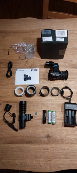 Lieferumfang wie Abgebildet: Pard NV007S, Datenkabel, OVP mit Anleitung, 3 x 16650er Akkus mit externen Ladegerät, 16 GB Speicherkarte, zusätzlicher IR Aufheller 940nm mit Halterung, die original Halterung, zweite schnellmontage Halterung für 38-47 mm Okulare, diverse O-Ringe für die Montagen.