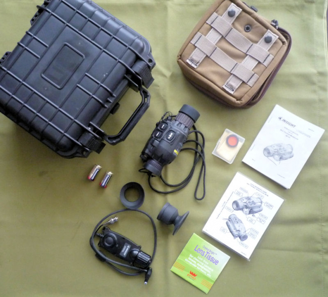 Zum Betrieb werden zwei handelsübliche CR-123 Foto Batterien benötigt. Das Gerät habe ich natürlich benutzt und immer pfleglich behandelt. Die Betriebsstunden habe ich nicht gezählt, sehr viele waren es nicht. Das MTM ist sehr handlich, Größe etwa wie ein PVS-14 Nachtsichtgerät, und es könnte auch an ein Kopftragegestell montiert werden. Für einen Begleiter mit Restlichtverstärker können Gegenstände mit dem eingebauten IR-Laser markiert bzw. angezeigt werden. Man kann Bilder aufnehmen und mit dem beigefügten Verbindungskabel auf einen PC übertragen. Mit einem entsprechenden Adapter (nicht dabei!) könnte das Gerät wohl auch auf ein Gewehr montiert werden (siehe Beispielbild). Hier sind die jeweils gültigen gesetzlichen Bestimmungen zu beachten!