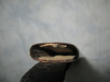 Stahlscheide, wie brüniert und mit zwei innenliegenden Federn. Lederhänger einwandfrei. Schlaufe läßt sich schließen.