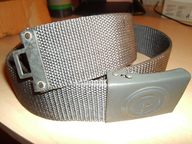 Koppel für Mannschaften und Unteroffiziere, der Nationalen Volksarmee der DDR, ca. 110 cm lang und 4,5 cm breit aus strapazierfähigem Gewebe in olivgrün, neuwertiger Zustand der Vorderansicht, die Innenseite des metallenen Koppelschlosses ist leicht flugrostig.