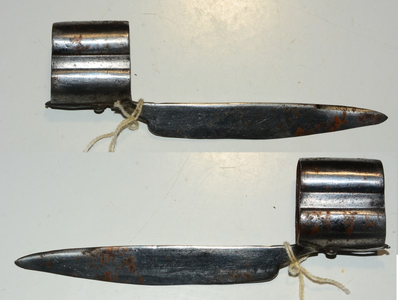 kleines Tüllenbajonett für kleines Doppellaufgewehr oder -Pistole, 11,5cm lange Messerklinge, Gesamtlänge 15cm, für Laufaußendurchmesser von 17,8 mm, Doppellaufbreite außen 33mm, guter Zustand mit Altersspuren