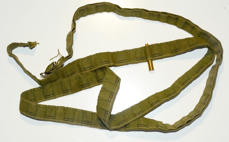 Patronengürtel oder Bandoullier oder Stoffgurt für Kaliber 5,6 bzw. .223, sieht nach US-Army aus, ungestempelt, 109 Schuss passen in den Gurt, eine Seite mit Schnalle, wahrascheinlich Vietnamkrieg, zumindest befindet er sich seit den 1970er Jahren in meinem Besitz